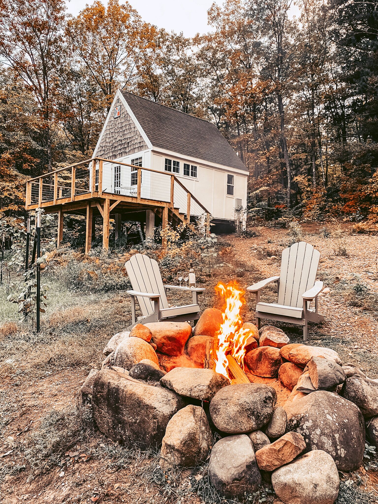 The living space is equipped with a Roku Smart TV and DVD player, as well as a queen sleeper sofa. Enjoy the view from the fully-stocked, modern kitchen. The cozy, quiet bedroom features a queen bed and modern ceiling fan/light combo. The spacious bathroom has a large walk-in shower! Head outside to utilize your cabin’s private patio furniture, grill, and fire pit. *Guests may use outdoor fire pit but are required to purchase their own firewood locally.* All linens, towels, and basic toiletries provided. Beach towels NOT provided. Kitchen stocked with essential cooking equipment and standard drip coffee maker.