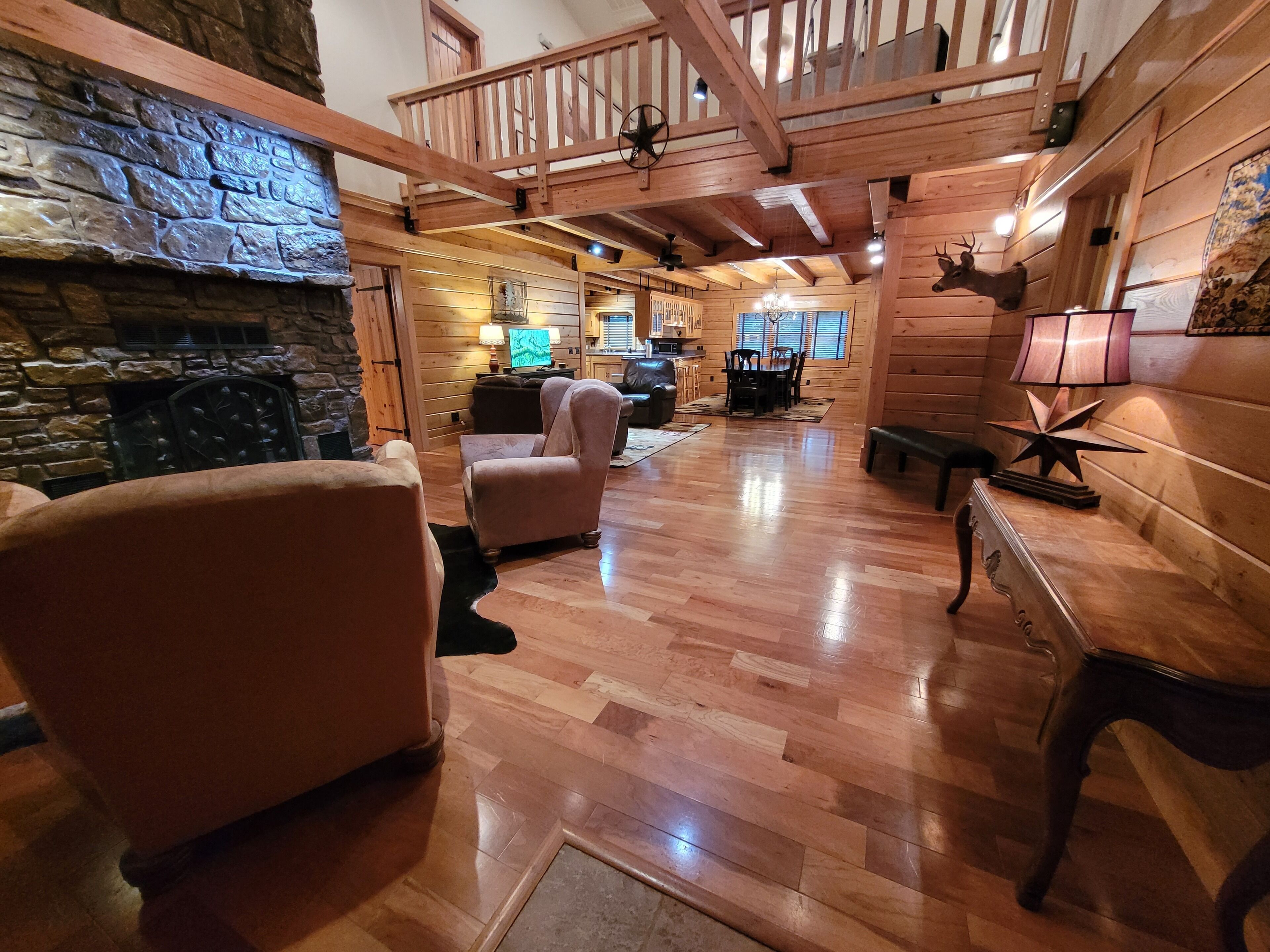 Comfort and cleanliness is our top priority for our guests and we take pride in providing wonderful accommodations for up to ten guests. The home is furnished with major appliances including a dishwasher, central heat and air, and ceiling fans in bedrooms and common areas. The spacious kitchen is fully equipped with utensils, dishes, and cookware. The main floor has a comfortable sitting area with stone fireplace, smart TV, dining, and two bedroom-bathroom suites that boast luxurious King-sized beds. Upstairs, you'll find a giant leather sectional couch facing our 120-inch projector screen, equipped with Amazon Fire TV and a DVD player, and board games for the whole family. Two more bedrooms sport four enchanting bunks and two ultra-supportive twin beds, respectively, and the kids will love building their own cabin with our Lincoln Logs set or pretend-camping in our campfire-themed play area! Outside is a beautiful wraparound porch on 3 sides with benches. Escape the daily stresses of life and relax in the tranquility the forest. Enjoy evenings on the deck watching the sunset through the trees or mornings sipping coffee while whitetail deer browse a few yards away. Spend sunny days hiking the nearby trails or evenings relaxing by the wood-burning fireplace.