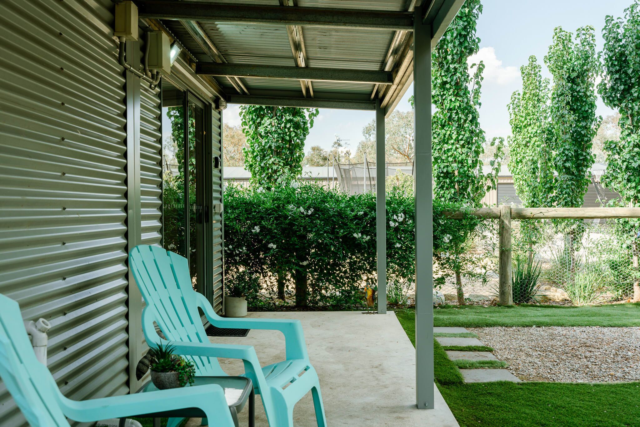Quite simply designed separate sleep out (metal unit) in the backyard of the house with separate new full bathroom unit.