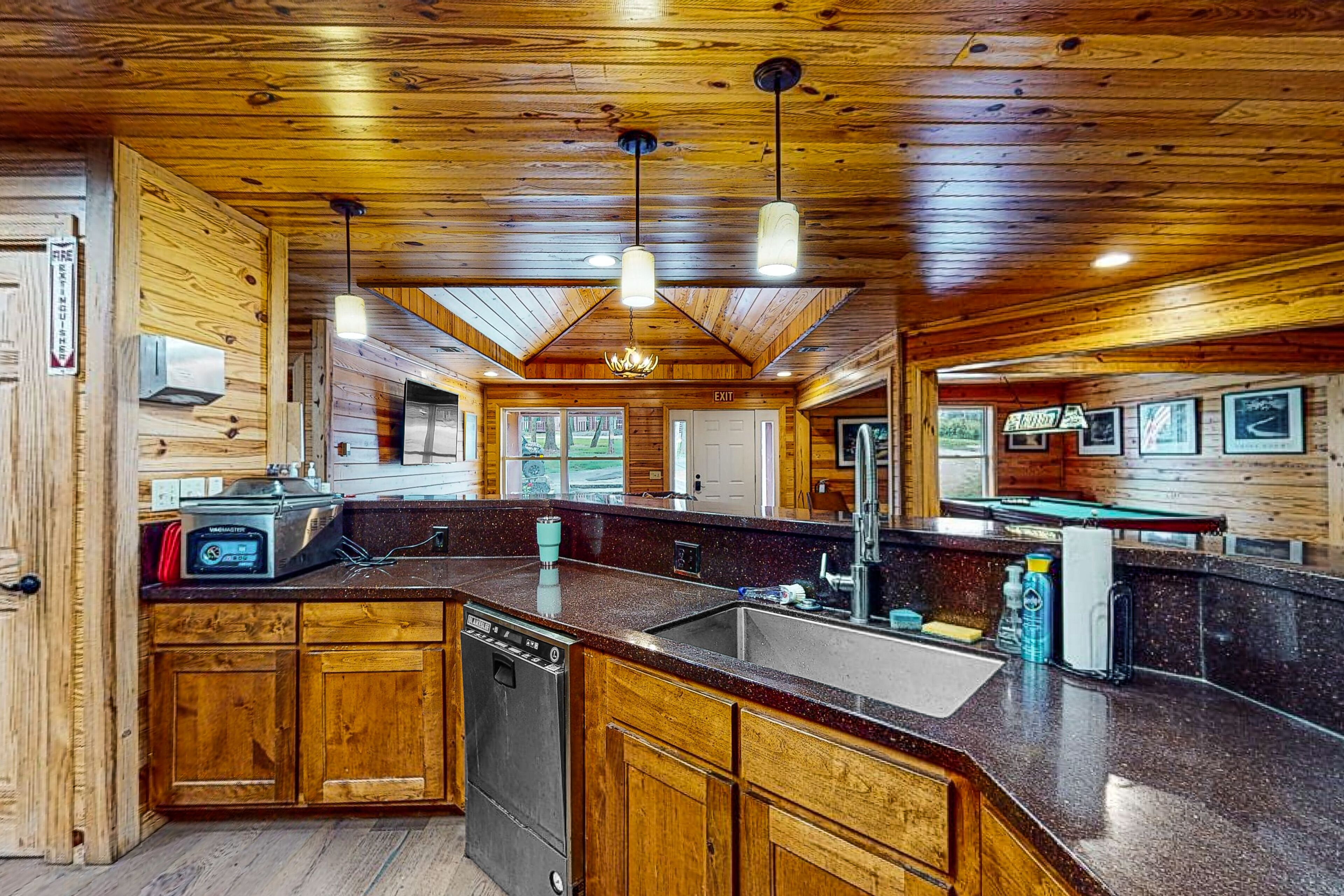 Take the tree house-inspired walkway to the front, where you will enter the cabin. Inside, enjoy a refreshing mix of natural tones that are designed to relax the mind yet fill you with excitement. The primary floor features a custom kitchen with a full appliance package. Fully equipped, you will have everything you need to cook during your stay including pots, pans, dishware, cooking utensils, and more.