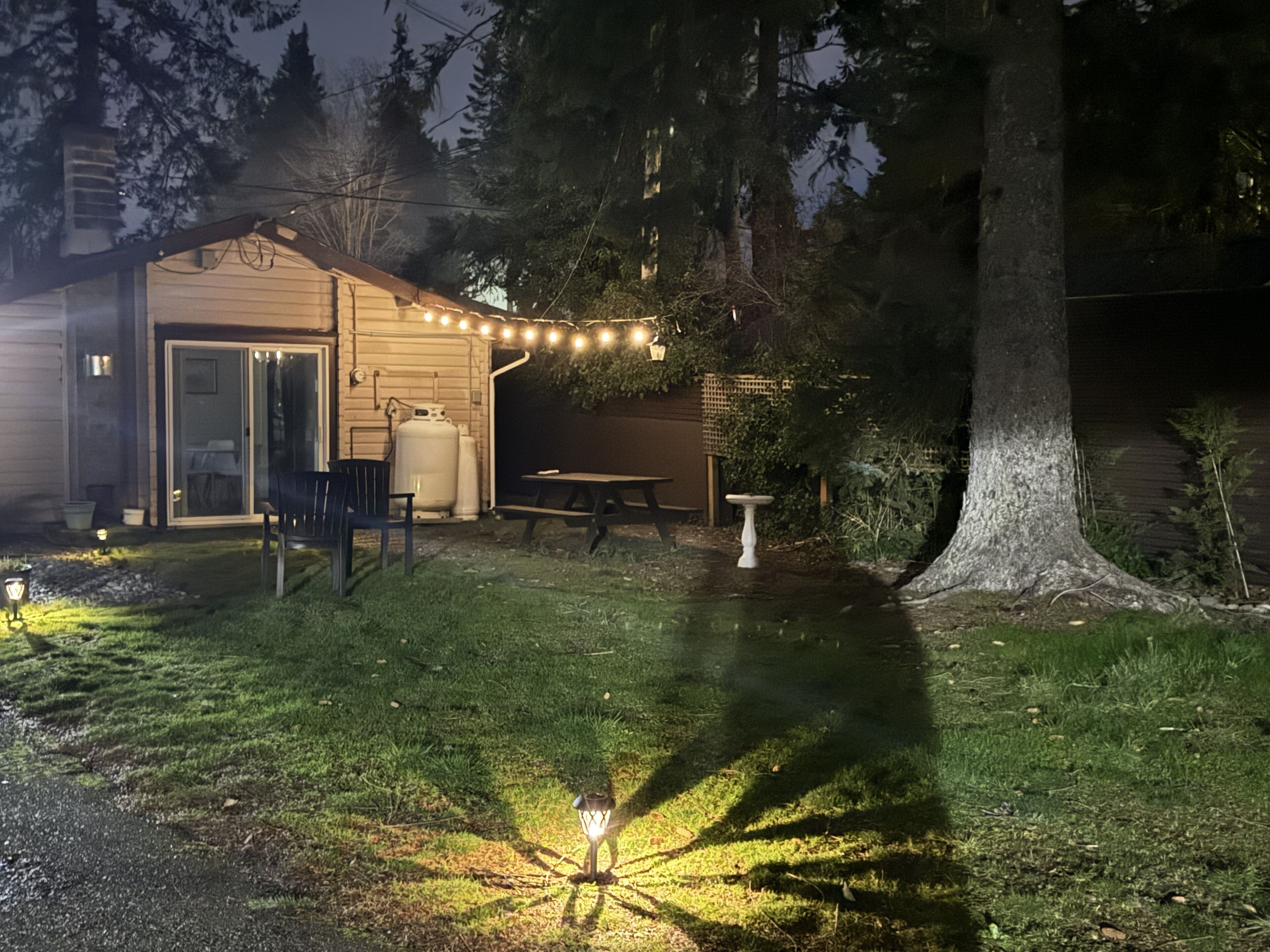 Our cabin features a fully fenced yard, perfect for your furry companions to roam freely. Start your day with a relaxing coffee on the covered deck, then set off to explore the stunning beauty of North Vancouver Island.
