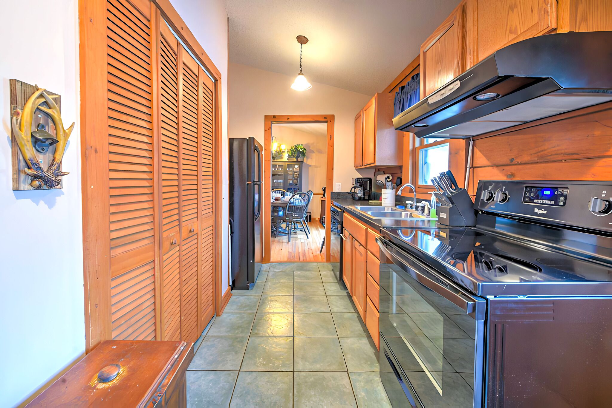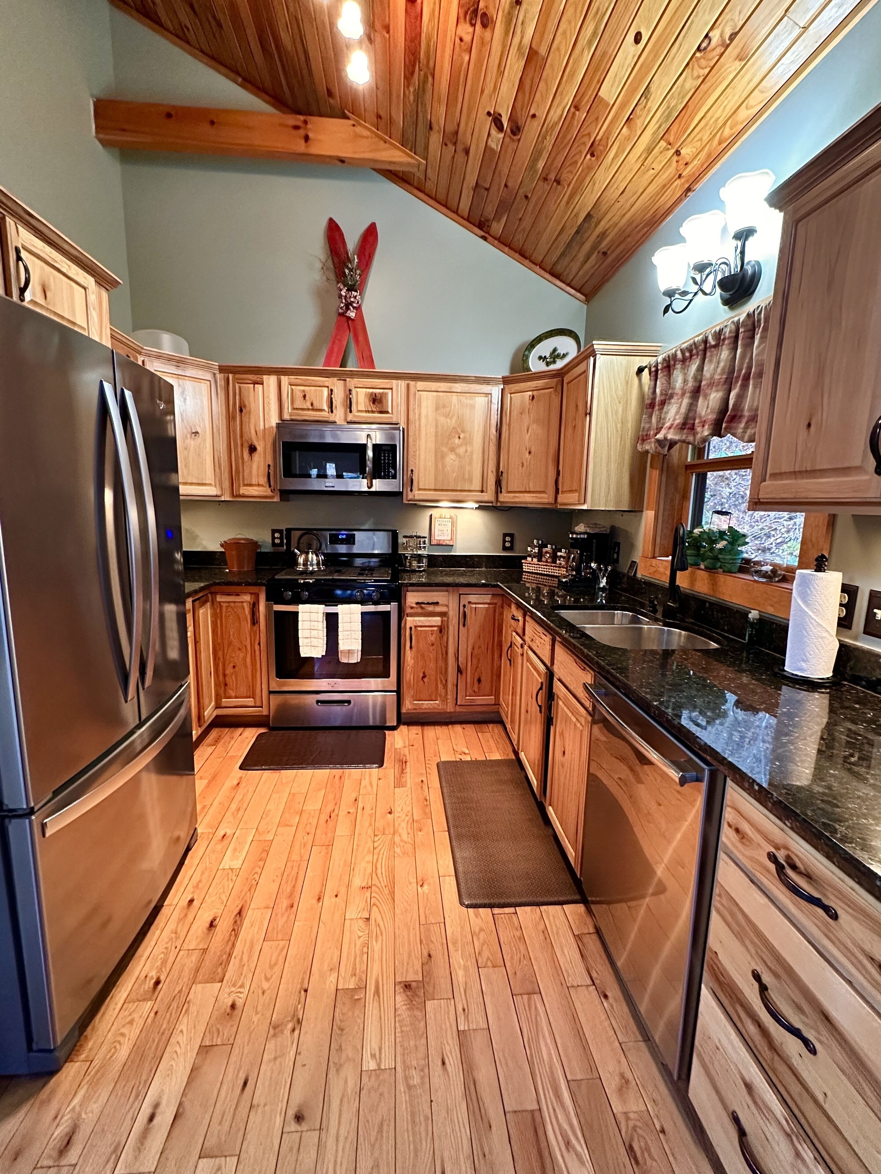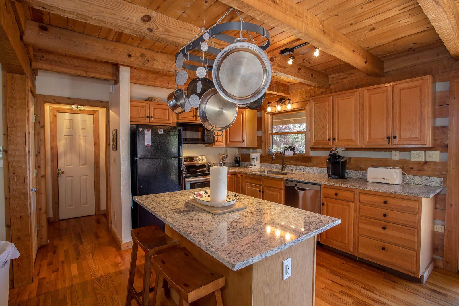 • Kitchen Supplies: Well-stocked with utensils, cookware, dinnerware, regular coffee maker, and a starter set--2 rolls of toilet paper per bathroom, 1 roll of paper towels, dishwashing liquid, liquid hand soap at all sinks, and black makeup wash cloths. Additional supplies may be needed. Sorry for the inconvenience but there is no dishwasher at our cabin.
