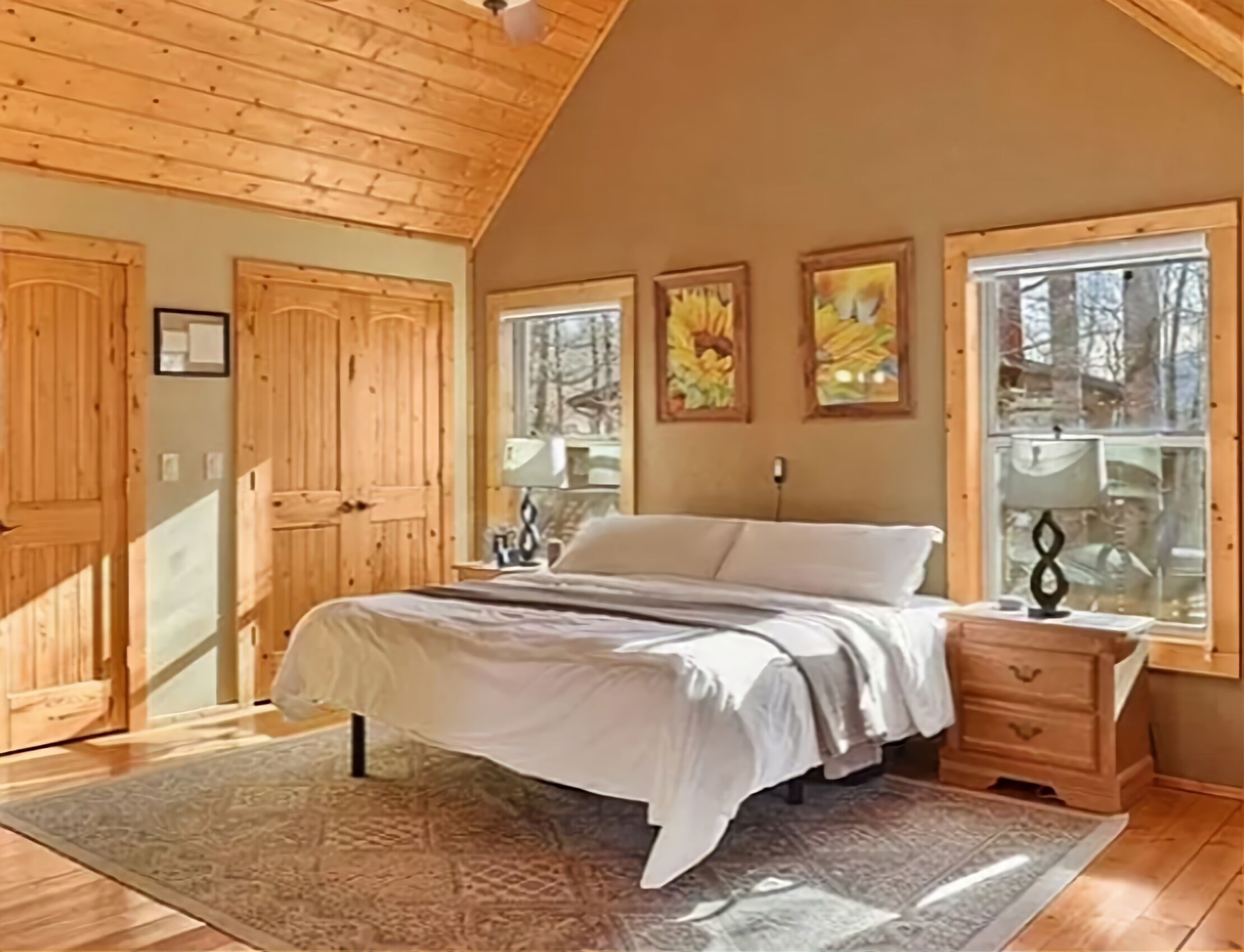 The master bedroom is decorated cabin-chic featuring a queen-size bed and is situated on the first floor adjacent to the large master bathroom. After a long day of hiking or skiing relax in the jetted tub.