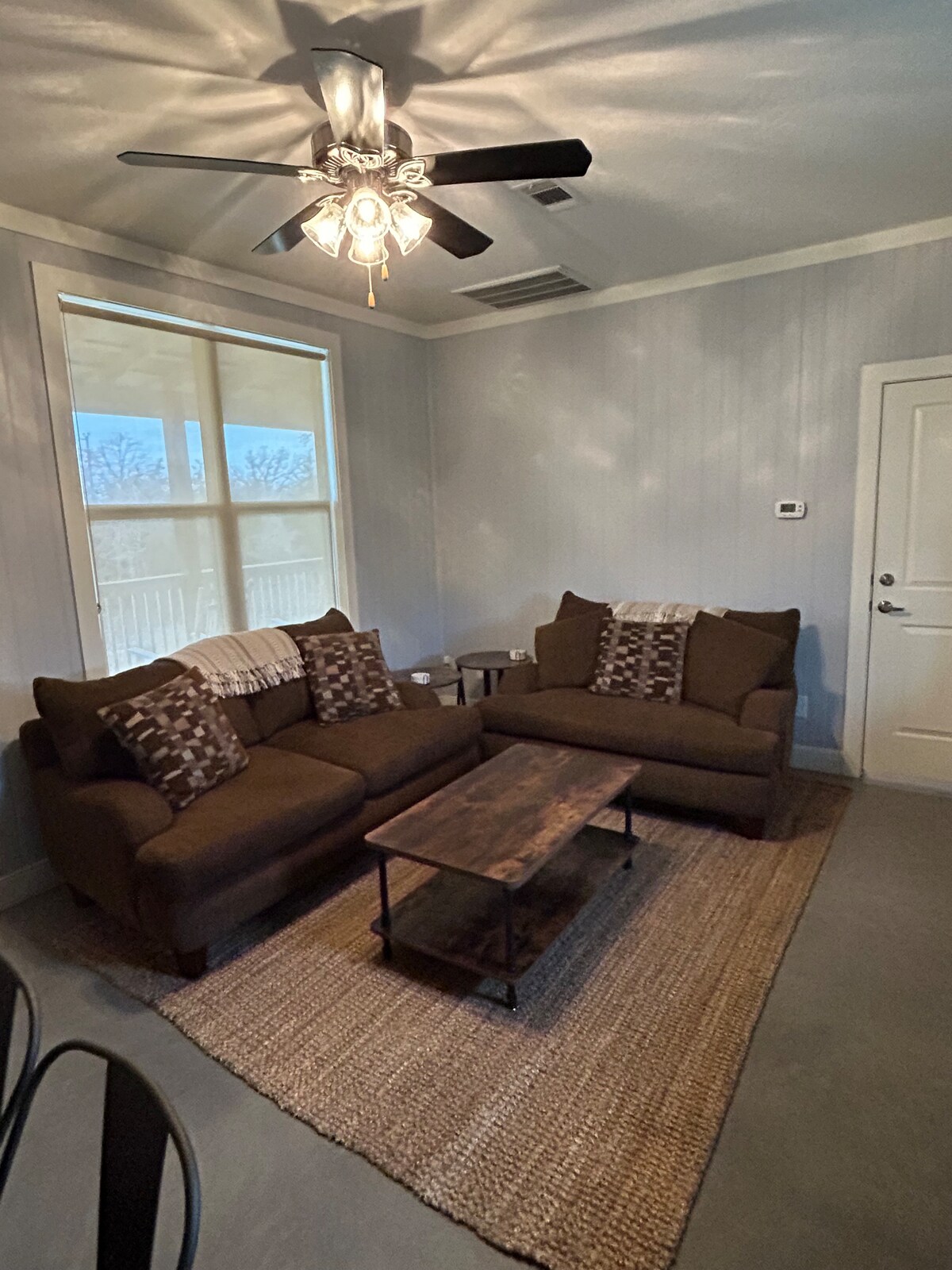 Step into history in this restored 1830s log cabin just minutes from downtown Round Top. Sleeps 2–3 with a queen bed, rollaway twin, cozy living area, and a kitchenette with fridge and Keurig. Enjoy rustic charm, relax on the shaded front porch, and explore shared amenities: pool, stocked pond, game room, courtyard, and pickleball court.