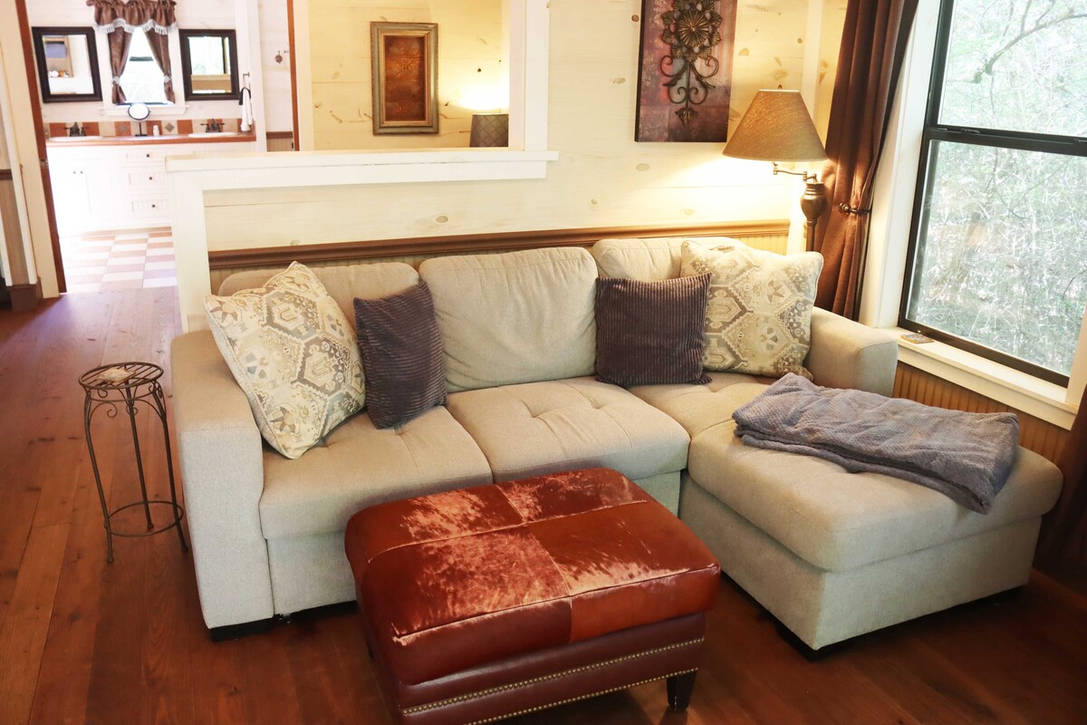 The Oasis is a Spa-Themed cabin, complete with Hot-Tub, Massage table, and large Bathroom area. The Oasis front porch has a 4-person hot-tub with a gorgeous view. It’s the perfect place to relax. Walk inside and the relaxation continues. Big windows and a sliding-glass front door bring the beauty of nature inside. The front room has a fully-functional kitchen with refrigerator, stove, and microwave. Breakfast items are provided for you.