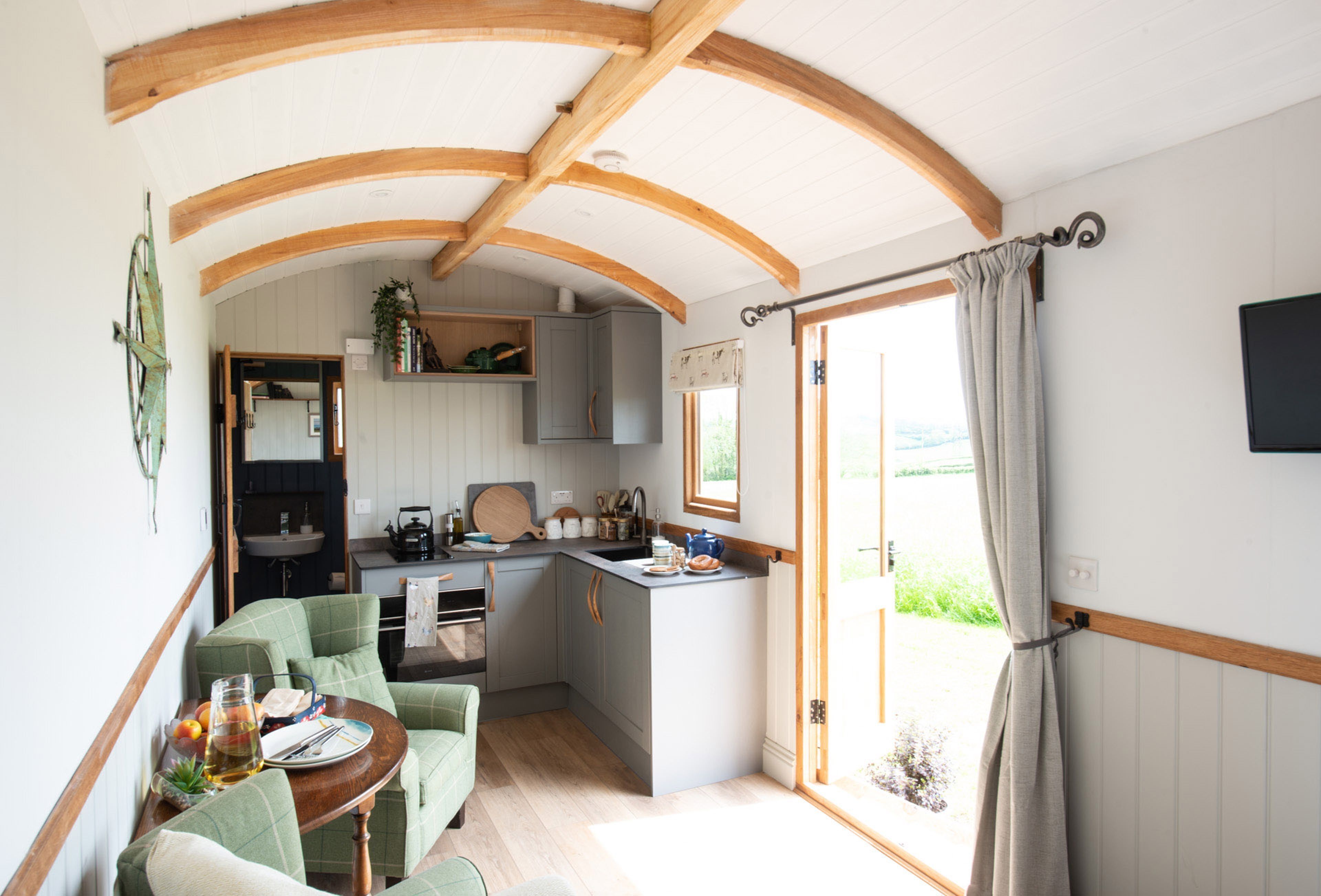 A bespoke handmade oak shepherd's hut, The Acorn has a delightfully styled interior. The accommodation comes complete with a well-equipped kitchenette, a cosy bedroom area with double bed, and a comfortable dining area with two wing back chairs. A shower room with walk-in shower enclosure, wash basin, and fully plumbed flushing WC completes this lovely retreat. With plenty of rural charm, outside is a lawned area with a wooden dining table and chairs, and a firepit where you can sit and enjoy the panoramic countryside views or gaze at the night sky. The double doors let the sunshine flood in, and you can sit in comfort as you enjoy your breakfast, lunch or dinner, listening to the birdsong.