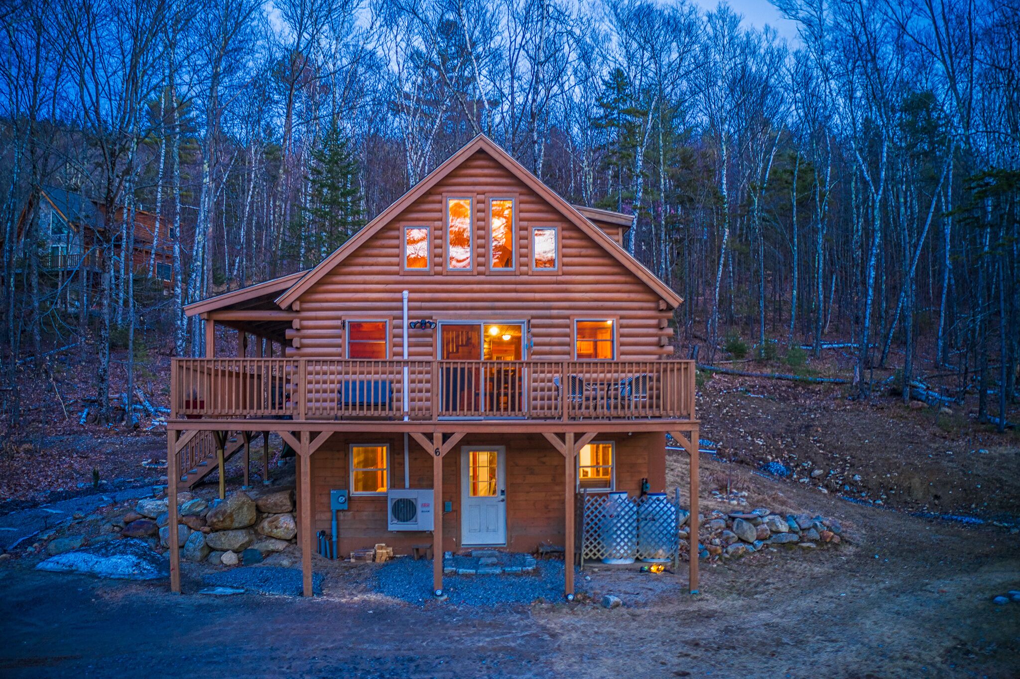 This amazing log home is best suited for people who are active and love the the outdoors. This property is so appealing because it is in a perfect location. It is 10 minutes away from Route 93, 20 minutes to Squam Lake and if you head North, it is another short 20 minutes to all the activities the White Mountains have to offer. The log home is situated mountainside on five acres of beautiful, pristine forest with a small mountain stream and winter views of the Sandwich range. In the summer it has a cozy and magical treehouse-like feel with the woods edge coming very near to the house. Even though there are neighbors close by, you really feel like you are the only one around! It is not unusual to see a flock of wild turkeys strutting by outside a window or to see moose and deer tracks on the snow!