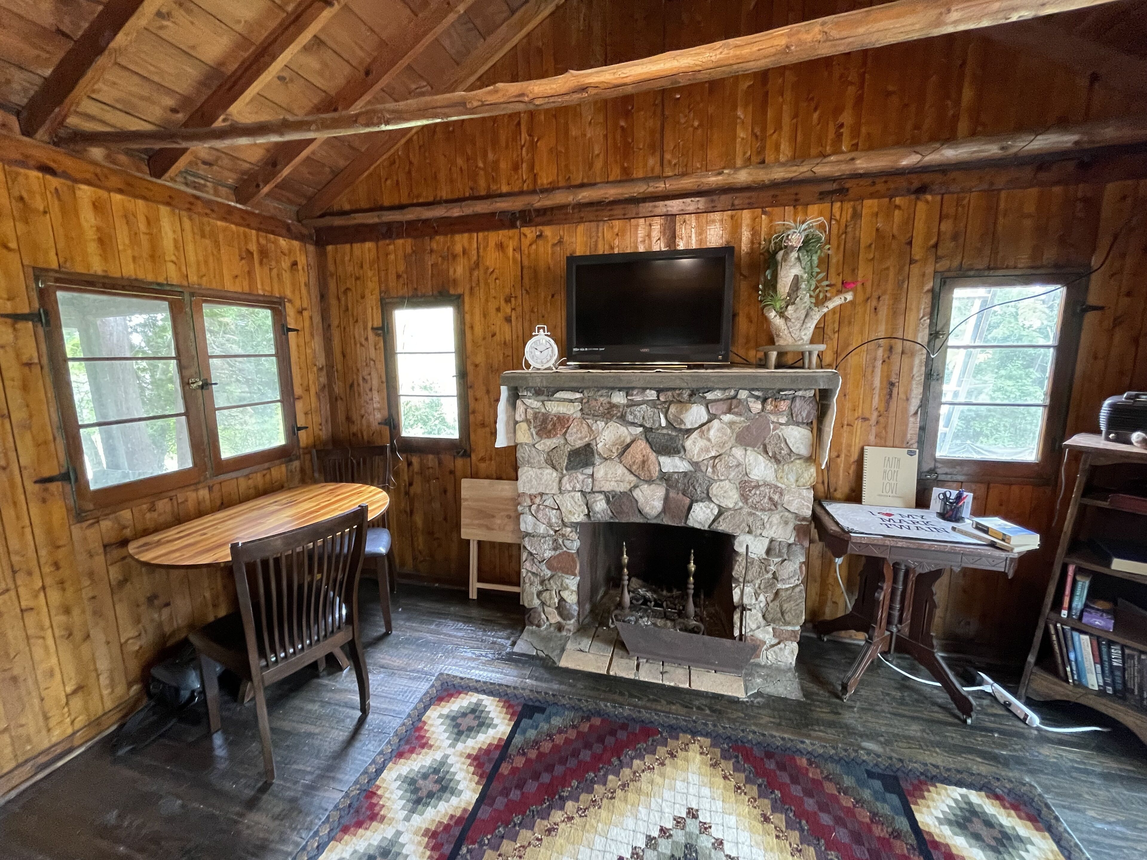 A cozy one-bedroom cabin that has lake access to sit or get right on the water! Upon entry, the fresh smell of wood hits your nostrils! With a Mark Twain theme, there is a cute kitchen and a full bathroom! Less than a 10-15 walk to the 3 lake access point! There is a large backyard with a hot tub on the deck!