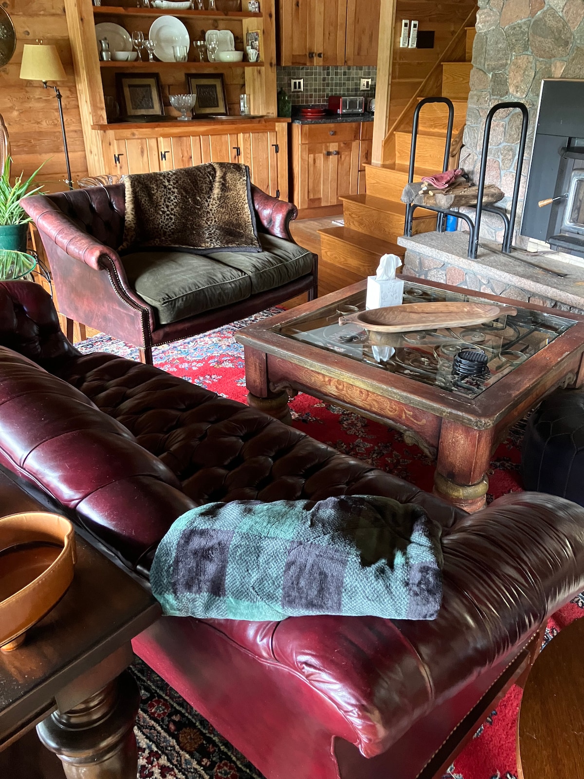 Our authentic log home is peaceful, comfortable and secluded. It features an open-floor-plan great room with a large 8-foot dining table, big skylights, a 21 foot ceiling, radiant heat on all floors and a wood burning fireplace for cozying up after skiing on snowy days in winter. There is a covered front porch with a hammock and rocking chairs, large deck in the back for grilling and dining outdoors in the summer. The upstairs master suite has a king-size bed, full bath and balcony/deck. There are two bedrooms on the main floor, each with double beds that share the main floor full bath. The basement bedroom has two twins and one full bed and is ideal for kids. The other half of the basement is a rec room with TV, a ping pong table and the 3rd full bath.
