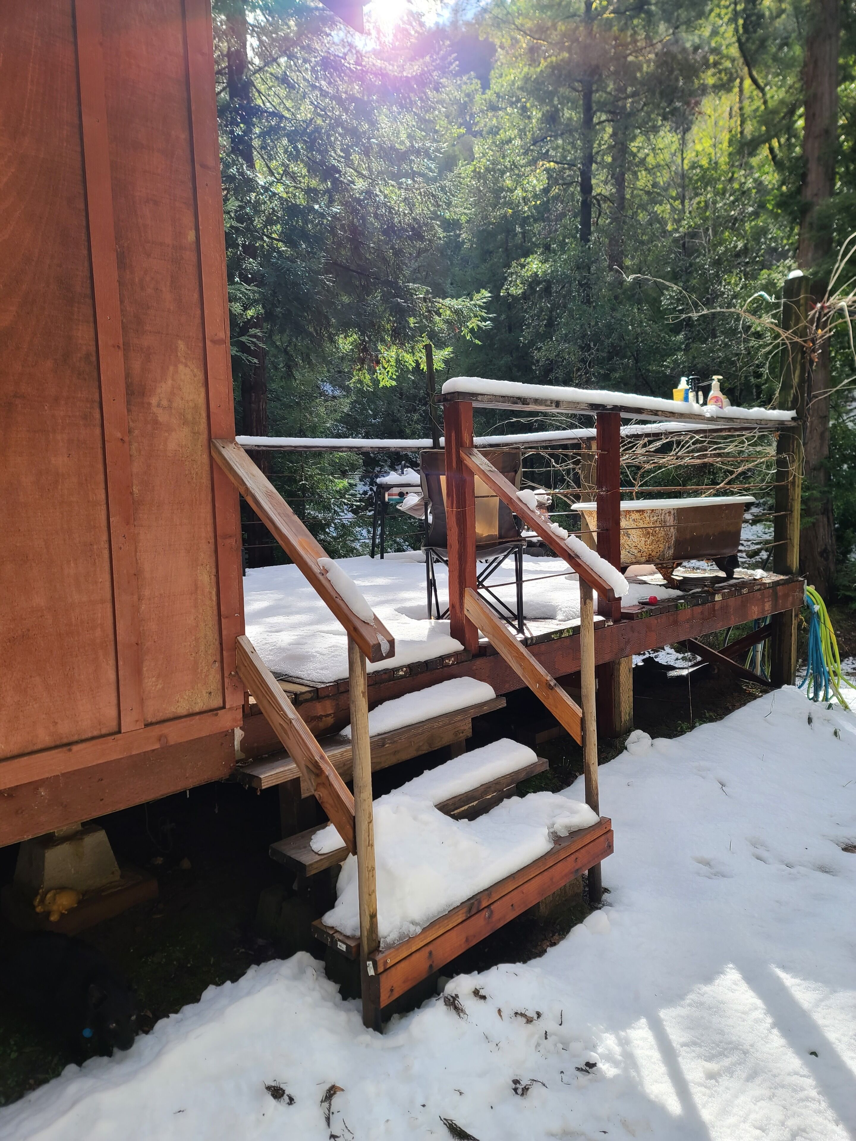 Outside is divine! The main deck sports a dining table for morning mimosas and alfresco meals, propane BBQ, large hammock (that gets a perfect amount of sunshine in the afternoon), plenty of welcoming seating and views up the hillside and into the redwood trees. It's the perfect gathering place between the main house and the private suite. Around the corner and completely private, a 6 person hot tub awaits. Just steps away is a private outdoor shower, hooks for towels and gate to the lower yard and fully fenced dog run.