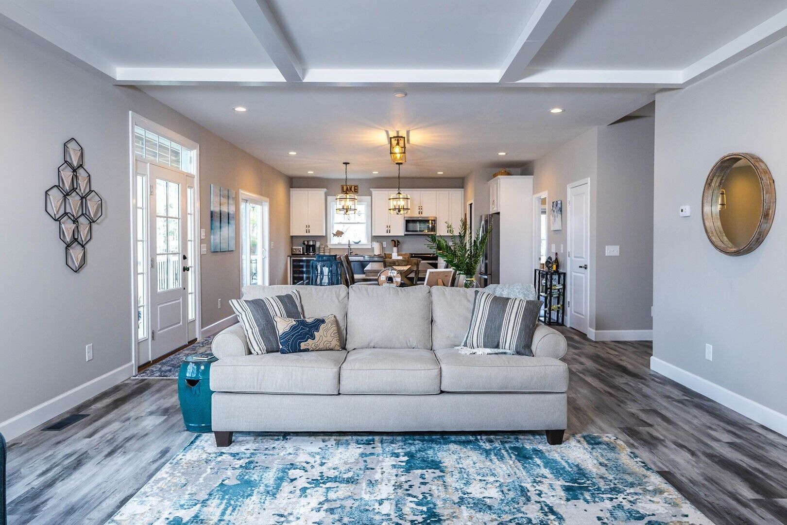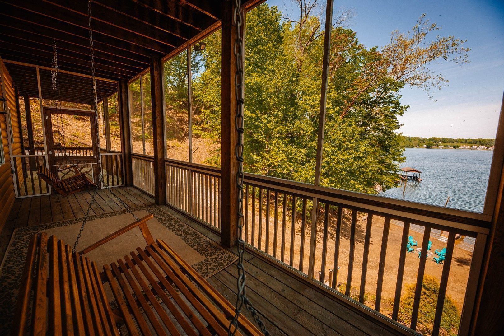 Step outside onto the spacious walk-out screened-in back porch that can be accessed right off the main living space. It offers stunning views of the lake and plenty of space for lounging, reading, or soaking up the sun.