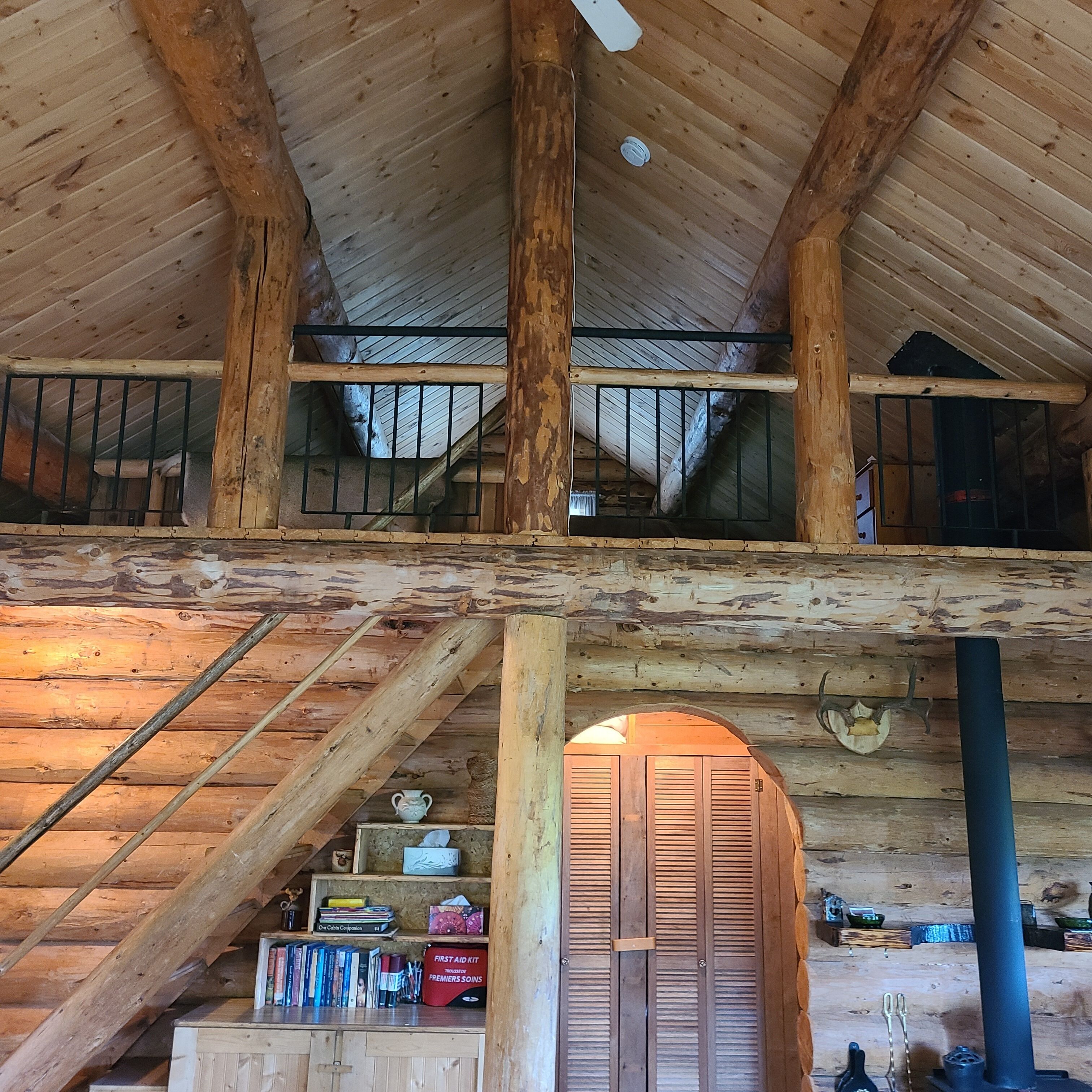 This little log cabin offers everything you need for a fun family get away! Master bedroom has a nice queen bed with charging ports at each night stand. The loft bedroom offers a queen bed and two roll away beds for kids or singles. The living room has a new Ikea sofa bed for extra sleep space. The big, bright kitchen offers all the amenities including a full sized fridge, stove, dishwasher, washer, and dryer. The three piece bathroom has a big soaker tub/shower combo, vanity and brand new toilet. This log cabin also has a screened in porch to enjoy the beautiful evenings! There's a hide a bed out there for anyone who likes fresh summer air. We are pet friendly - you'll find a few amenities for your furry friends including food & water bowls. Be sure to bring their favourite blanket for extra comfort. Outside there's a barbeque in the gazebo and plenty of seating around the firepit for roasting marshmallows. There's ample room to load/unload your quads and space to park them close by for the night. The area offers excellent quad trails for all levels, plenty of space for mountain bikes and hiking. The nearby lake is within walking distance and the creek is just a few steps up the road for the kids to catch minnows in - nets provided! While there are neighbors either side of you on this little dead end road, the large, heavily treed lots allow for a lot of privacy! Split rail fences between properties suit the area but won't keep dogs in or out.