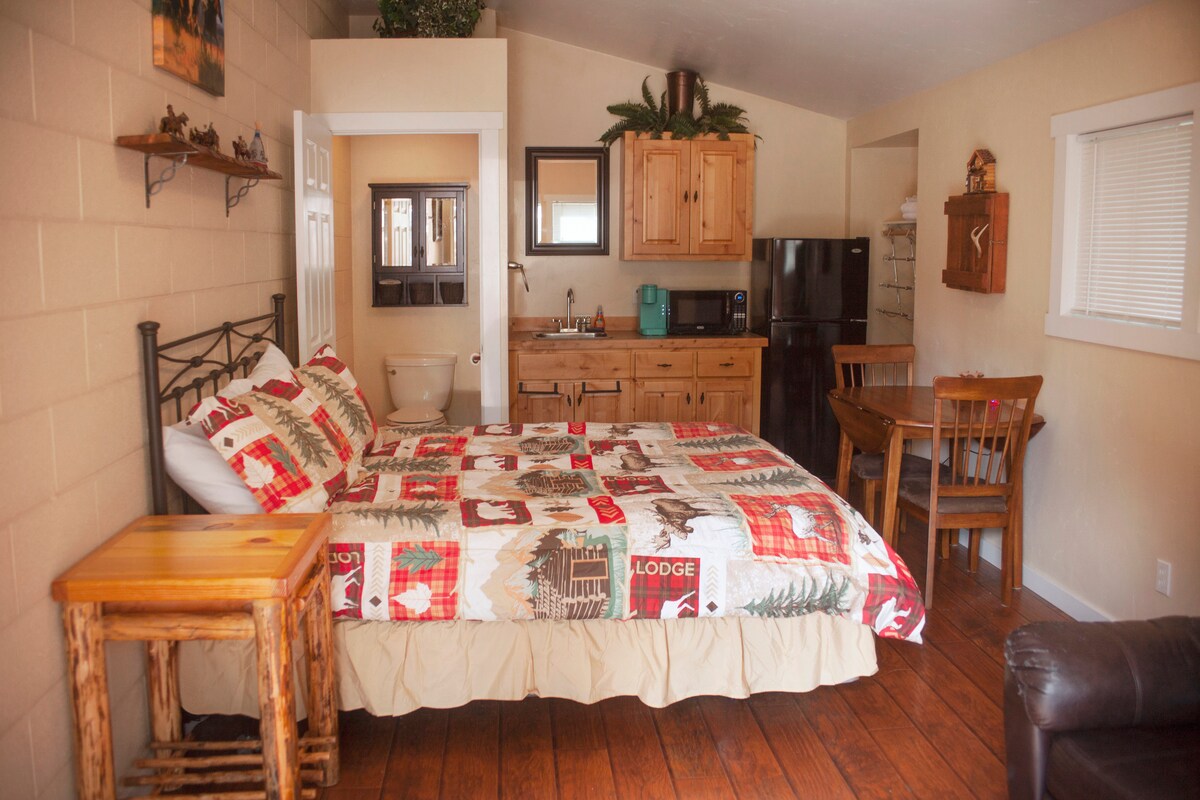 This newly built (2020) cozy studio cabin is surprisingly affordable for the amenities you will find. Unwind after a day of hiking, boating, horseback riding, or any of the other outdoor activities the Flathead Valley has to offer. Only 16 miles from the West entrance to Glacier National Park. Cabin D has an efficiency kitchen with microwave, mini fridge, 2-burner hot plate, sink, dishes, and pots & pans. The open living area has a queen bed, love seat, TV, dresser, and a compact kitchen. There is also a private bathroom with a shower. Linens are provided for the bed, bathroom and kitchen.