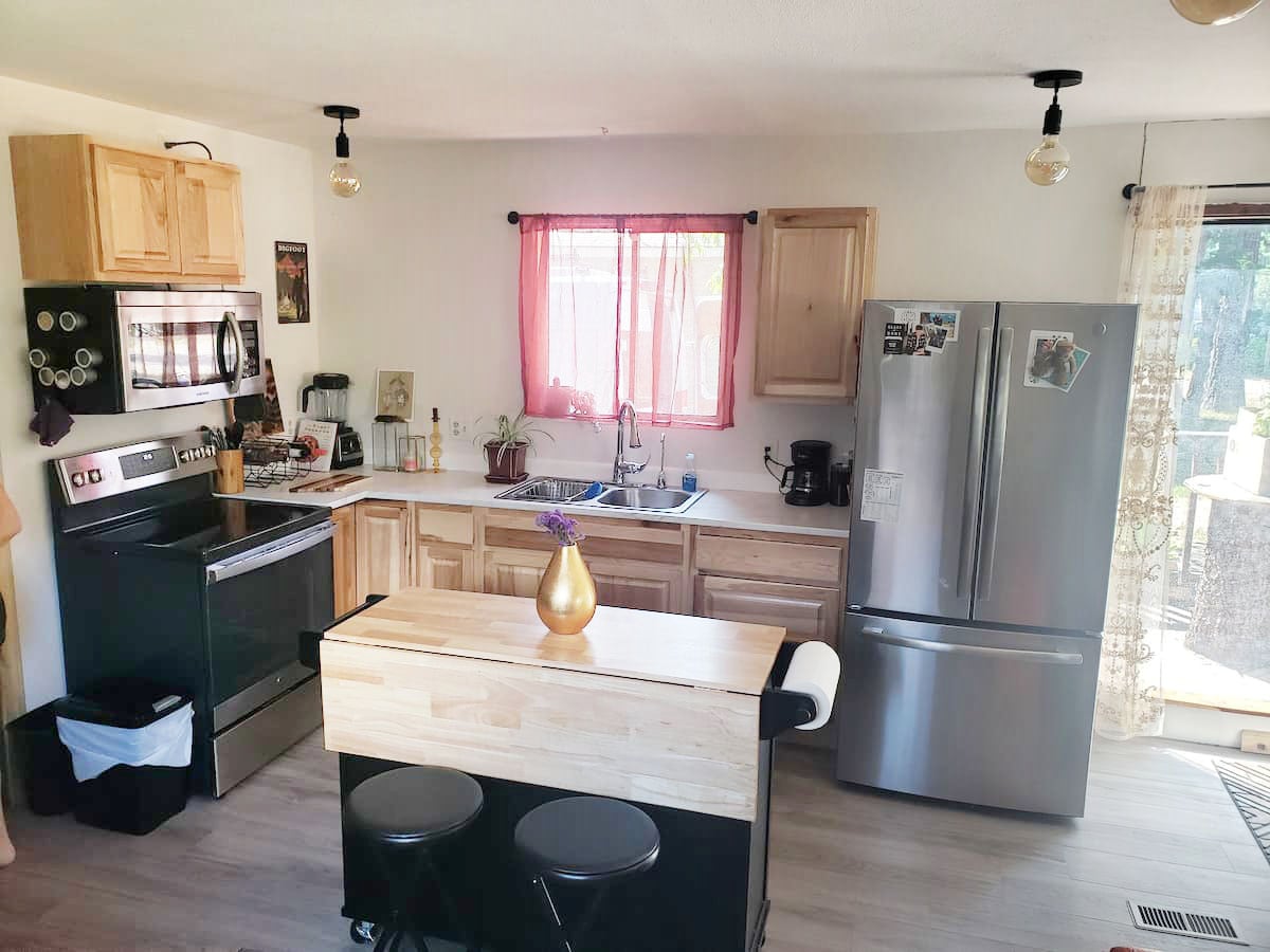 The kitchen space has everything you'll need, including a full-sized refrigerator, stove top, oven, microwave, and double sink with disposal. The rental also comes equipped with pots, pans, dishes, silverware, and common utensils to make cooking in the tiny house easy and affordable.