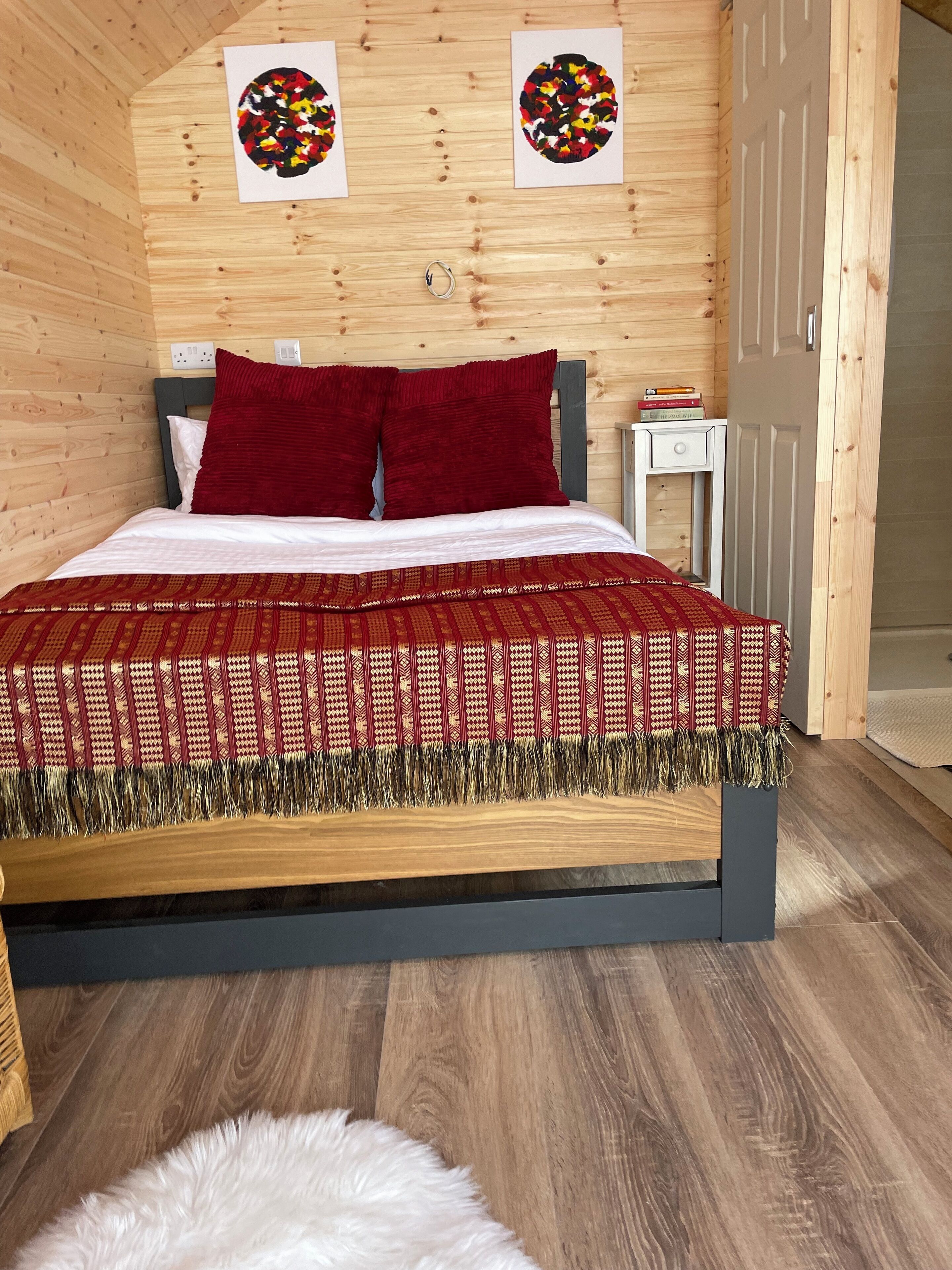 The Red glamping pod consists of a double bed and 2 additional double sofa beds . Comfortably sleeping 4 adults or a family of 6 (2 adults and 4 kids). The red pod is ensuite with a toilet and hand basin with hot water.