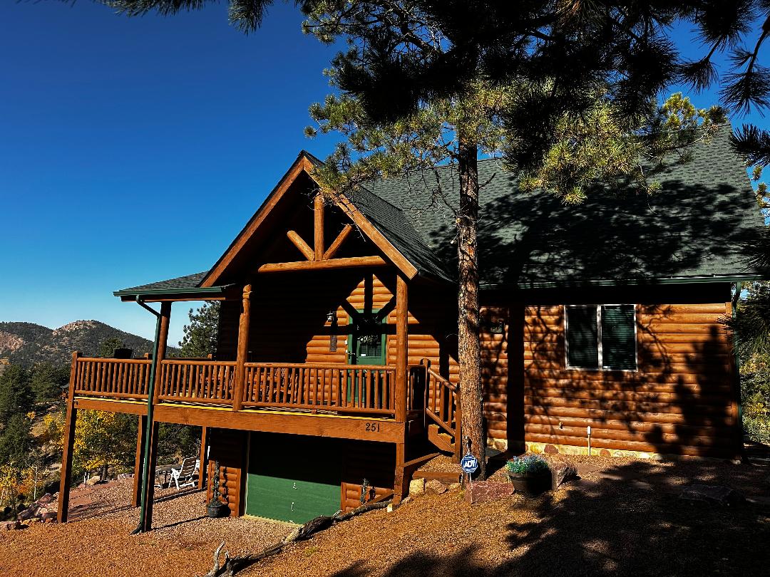 This rustic, cozy, secluded cabin is perched on the side of a mountain just 10 minutes from the historic town of Cripple Creek. Enjoy the large wrap-around deck in sun or shade as half of the porch is covered and half is uncovered. Roll-up sun shades mounted on the covered deck are available to help protect you from the late afternoon sun, if desired. The view from the deck is stunning with a clear view of Mt. Pisgah.