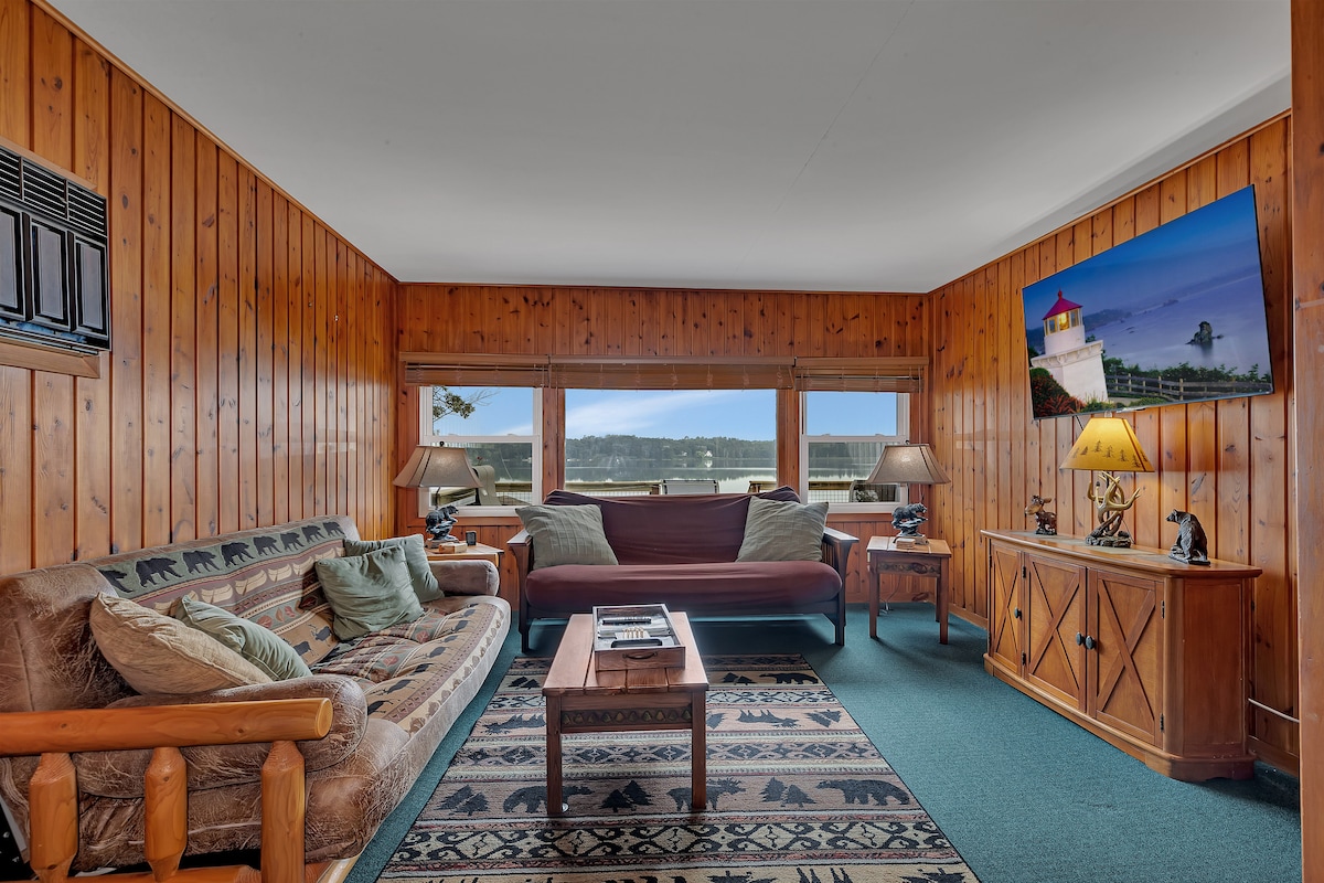 Cozy, Inviting Interior: The open-concept living area is adorned with warm wood paneling, rustic decor, and comfortable furnishings. Relax on the sofa bed while watching your favorite shows on the flat-screen TV, or enjoy a quiet evening with a book as the natural light streams through the large windows.