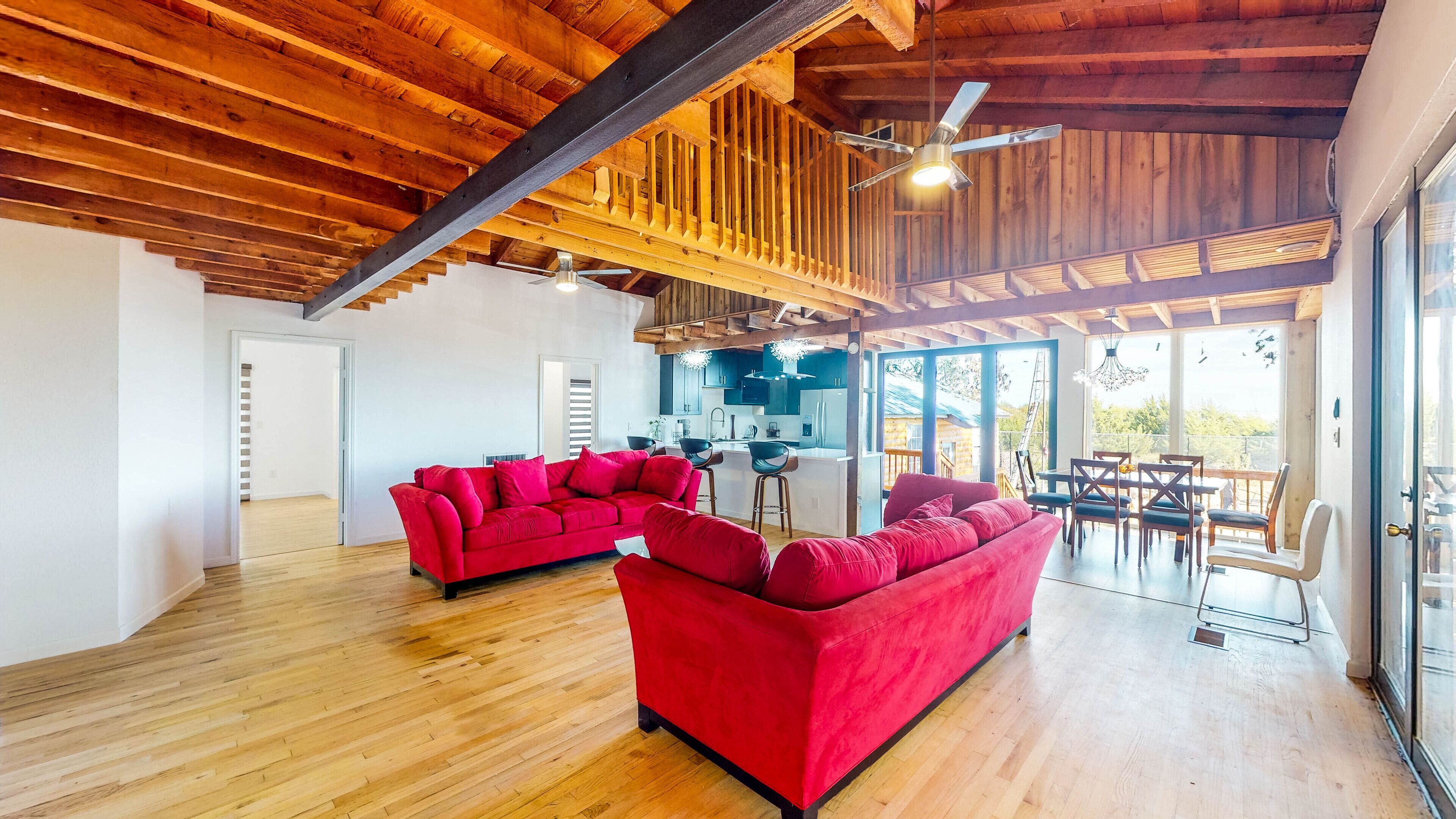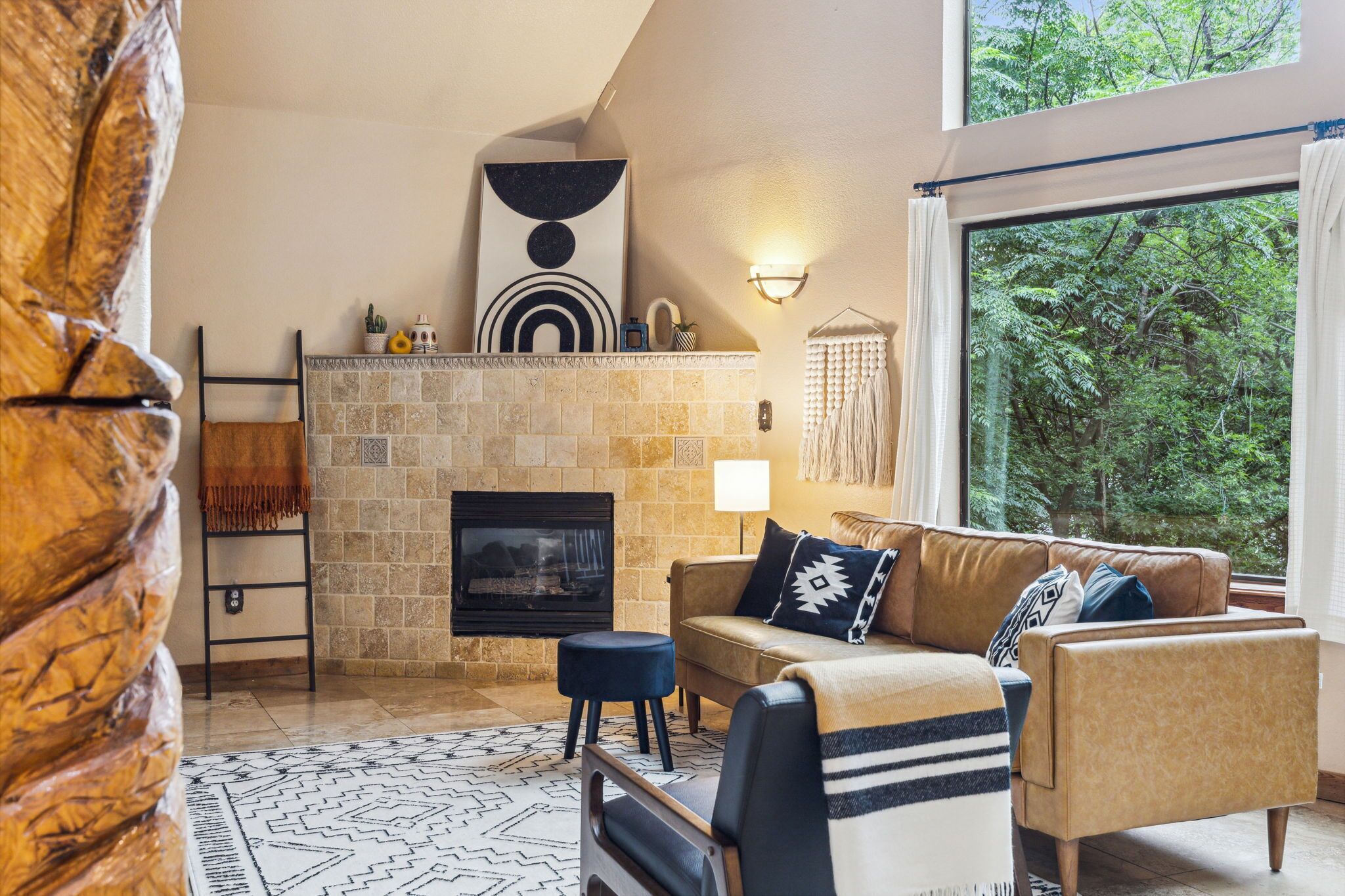 Beautifully designed, this home features high ceilings, wood floors, and exposed beams. Unwind in the open living area and watch shows on the 75-inch LCD smart TV. An electric fireplace in the primary suite adds a cozy touch.