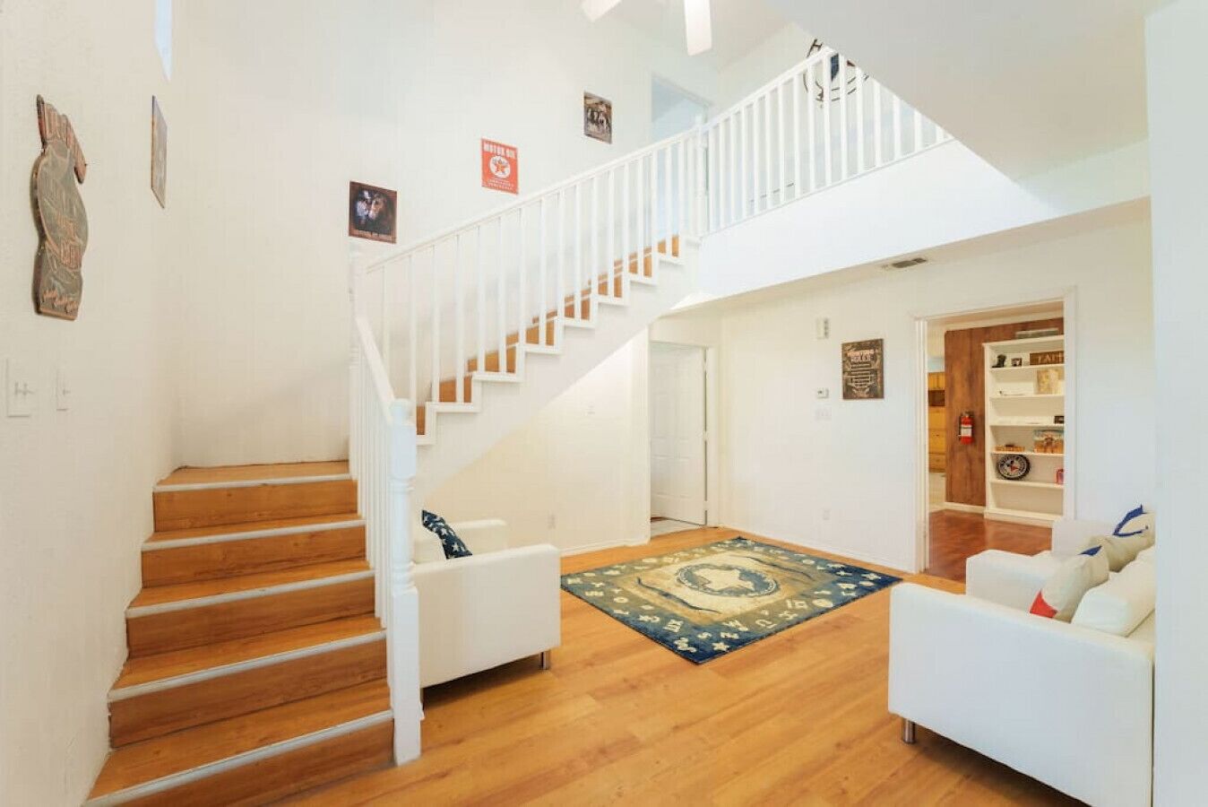 Upstairs the loft features a plush king size bed, twin trundle daybed, spacious bathroom with separate shower and jacuzzi tub, a cozy reading nook and the perfect space for yoga!