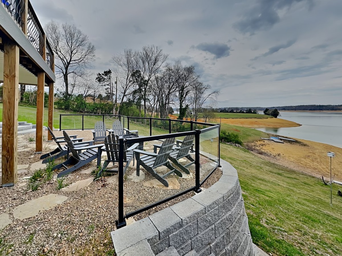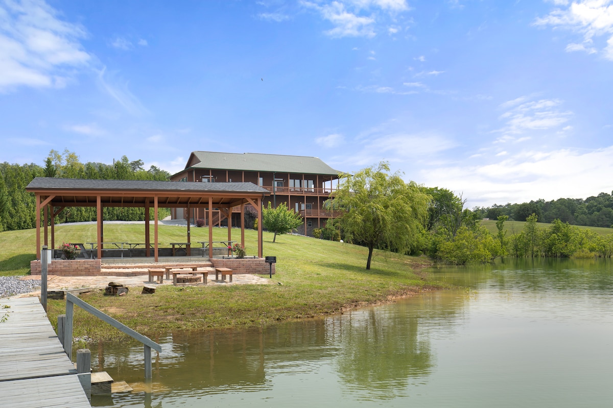 The gourmet kitchen has wood floors and granite countertops, stainless steel appliances and everything you need to prepare and serve anything from a simple snack to a lavish brunch. Or if barbecuing is more your thing, the covered picnic pavilion is the perfect place to do it, thanks to a charcoal grill and multiple picnic tables dining table with plenty of seating for relaxing and enjoying the lake view.
