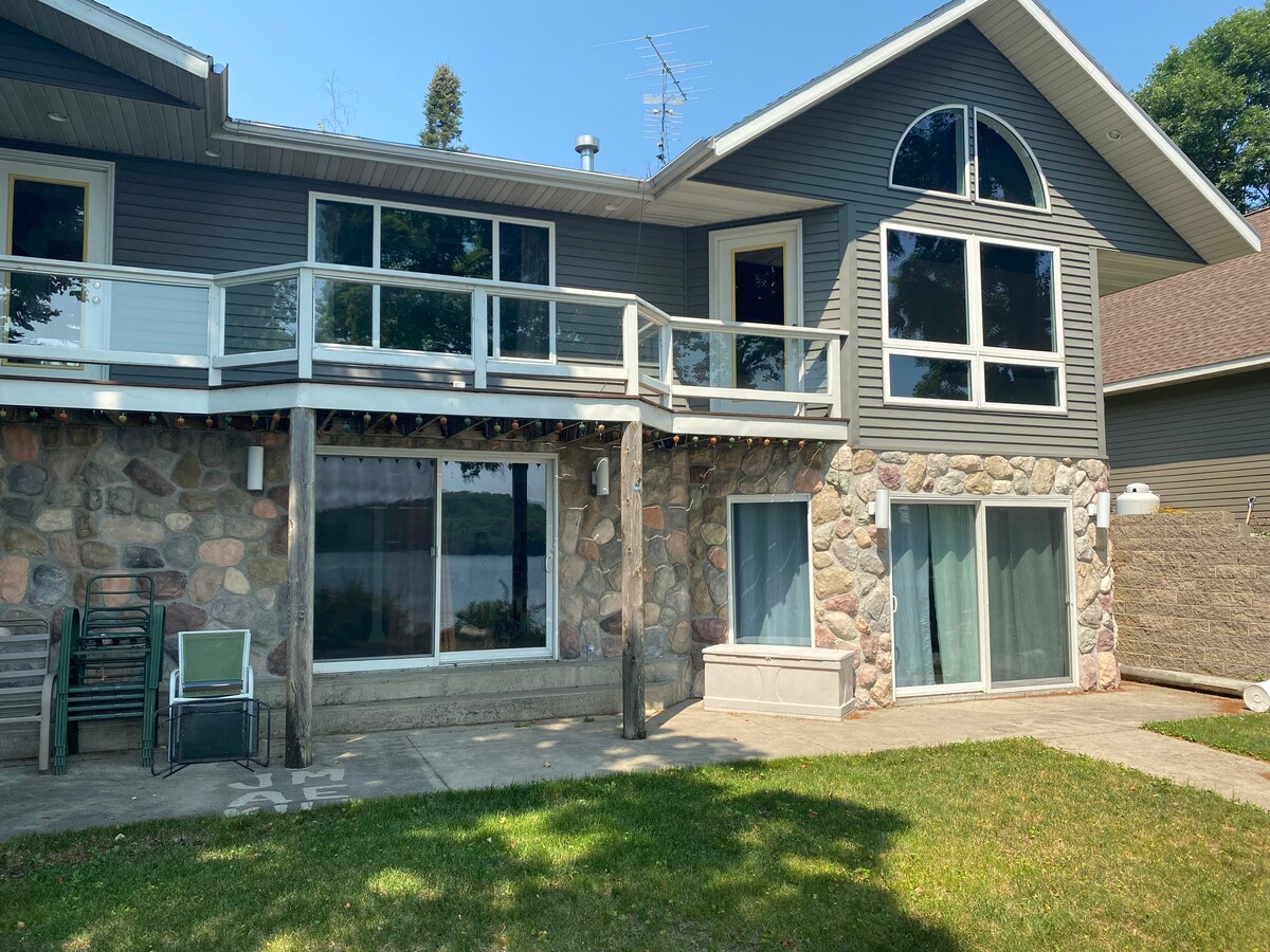 Nice lot without any steps to the lake. 3000 square feet on a secluded lot on Pearl Lake. 4 Bedroom home with a fireplace, loft, central air, huge deck with propane or charcoal grill. 2 patios for more outdoor seating.