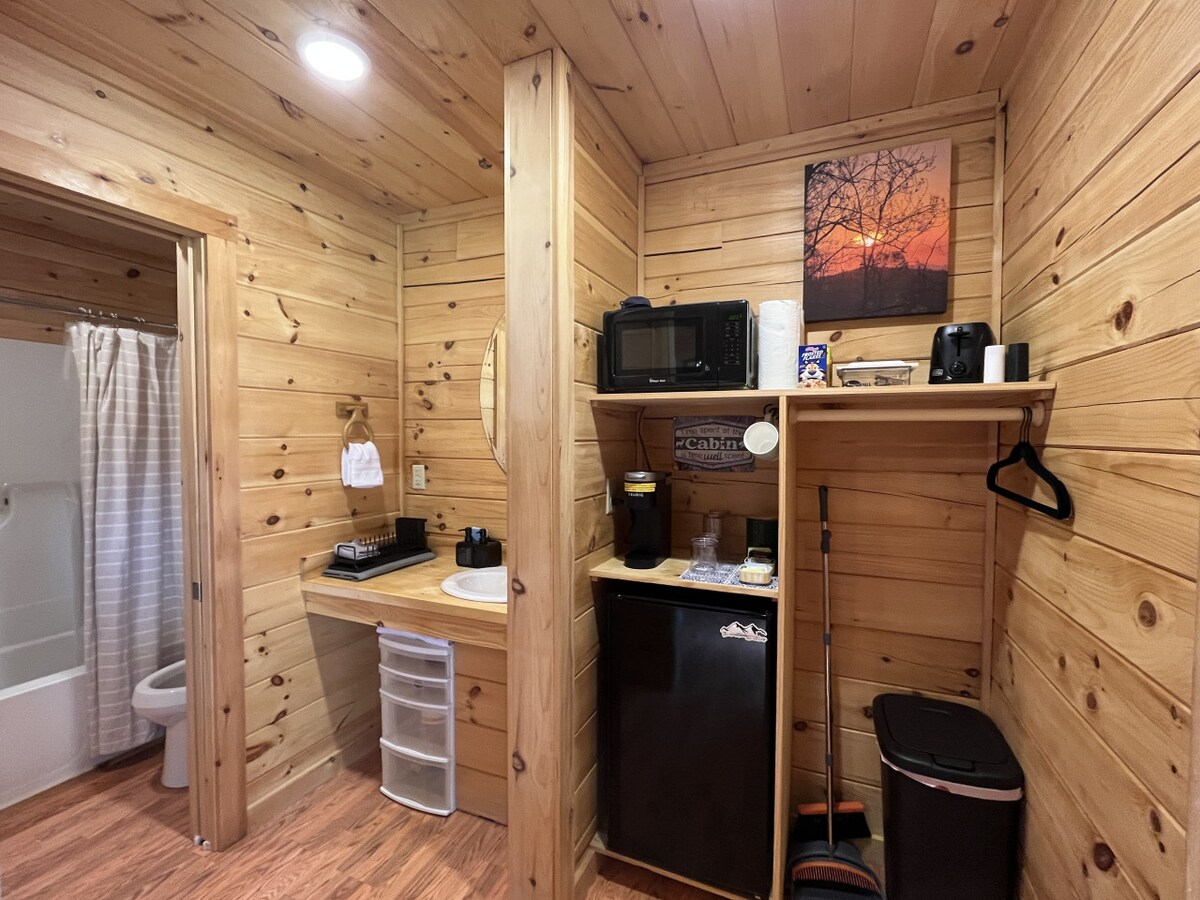 After a day of exploring the breathtaking sights and activities along the Parkway, come back to our cabin and unwind in our comfortable king size bed. Bring home dinner from one of the wonderful restaurants in town and enjoy it on the covered porch while taking in the picturesque mountain views. For a cozy night in, snuggle up and watch a movie in bed. Our little kitchenette is perfect for keeping snacks and drinks cold or warming up a quick meal.