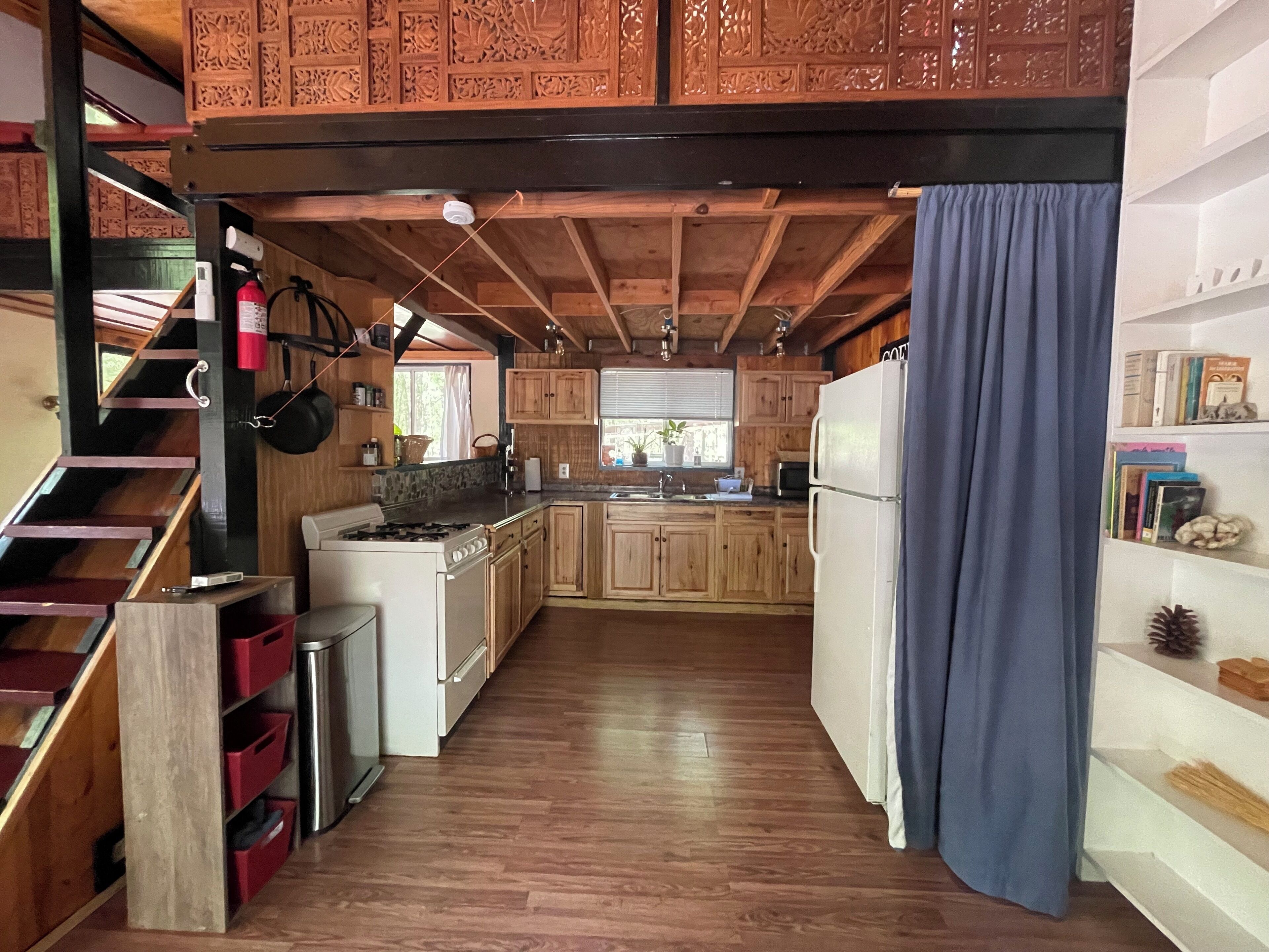 The stove and hot water are gas. The stove heats up quickly so please do not leave any pans on the stove unattended. Please do not use a metal utensil to stir or flip, etc. on the pans as it will scratch the non stick. The kitchen counter top is butcher block. Please do not cut on it directly or place hot items, etc. on the counter as it will permanently mark the counter top. The hot water is tankless and is automatic and endless. There is a gas grill outside. It takes the small propane tank refills. Guests are responsible to provide their own gas canisters.