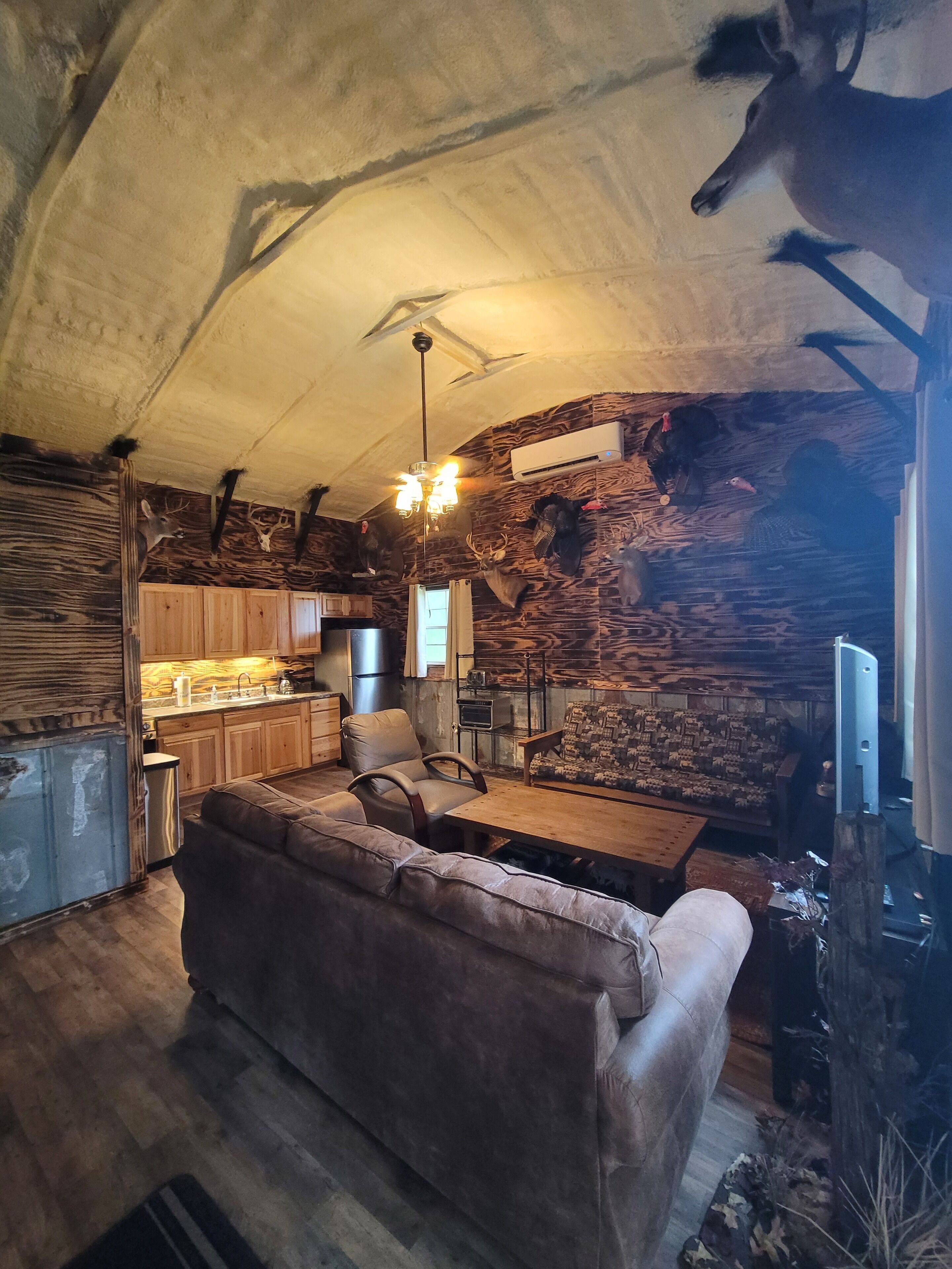 NEWLY DECORATED private, cabin themed, studio. Includes a fully equip’d cooking area w/microwave, broil/bake &toaster oven, coffee&hot pot crockpot electric skillet, new large fridge, electric burner & skillets. Dishes silverware, cups bowls large serving platters large bowls for chips &dips wine opener &more. The private toilet closet & a private cedar shower w/ segregated double sinks completely separate from the sleeping area. SEE 3 other RENTALS on property for groups traveling together.