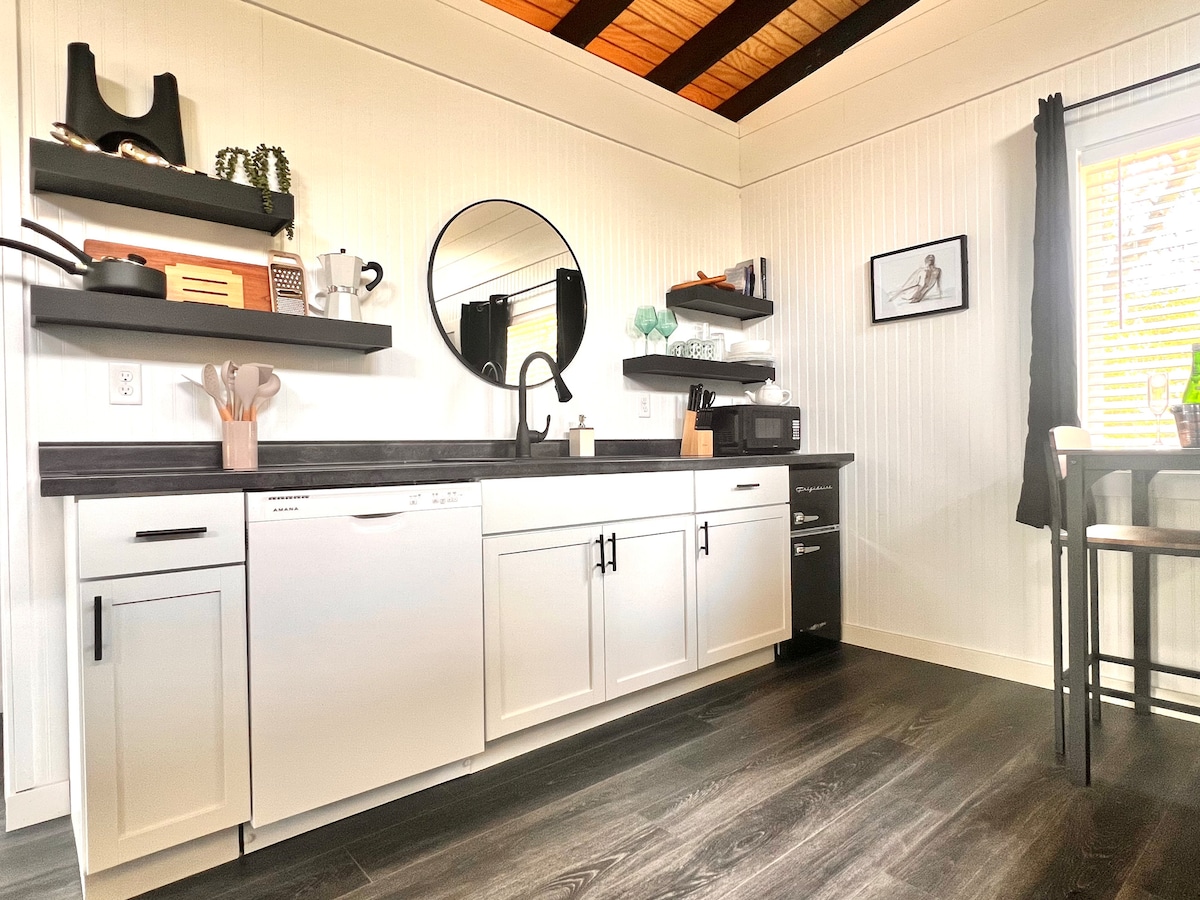 In the kitchen, enjoy a coffee bar. Kitchen is fully stocked with kitchen gadgets. Crock Pot, plenty of new dishes and dining ware. Smart TVs in living rooms upstairs and downstairs, as well as all bedrooms.