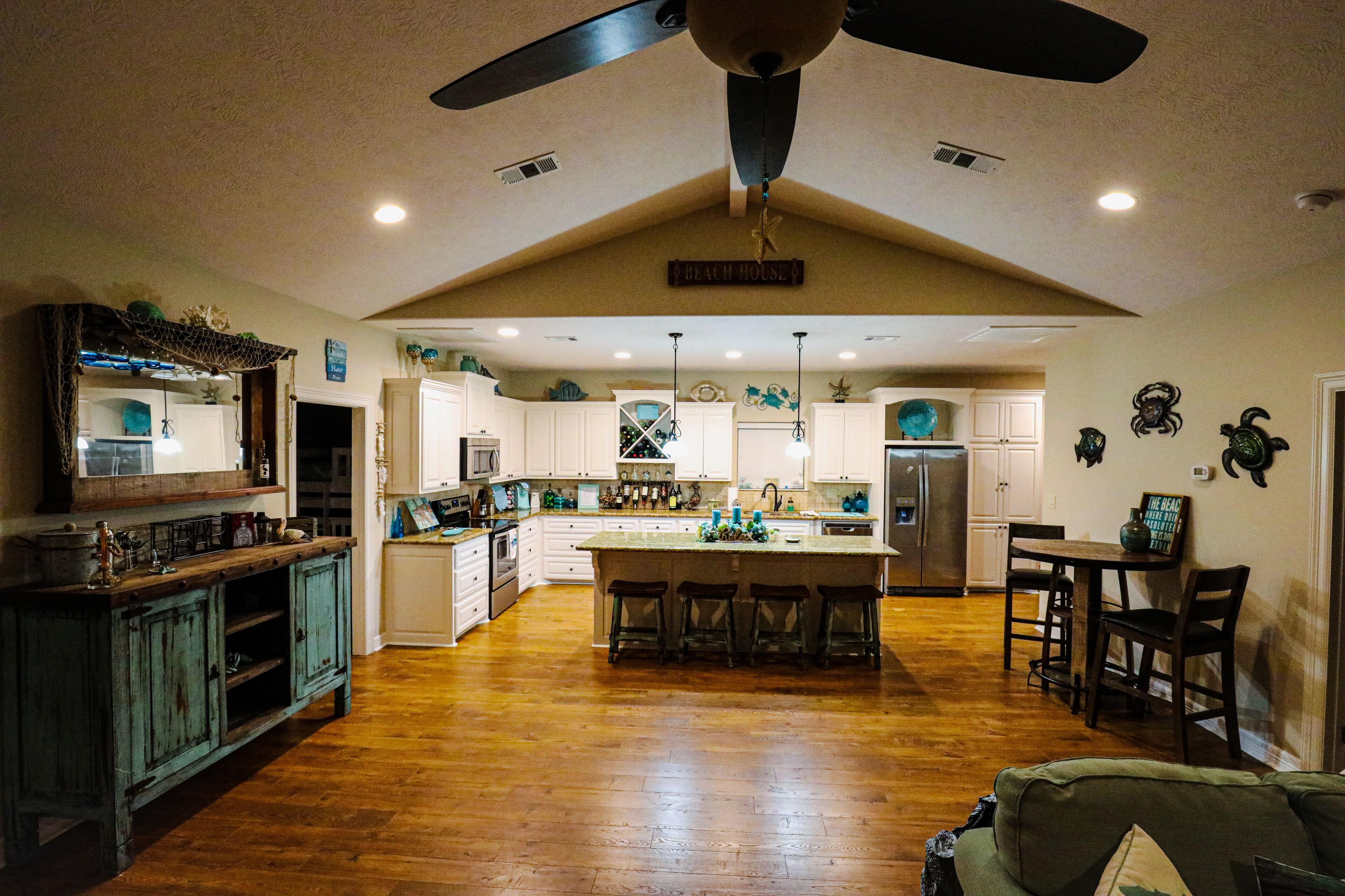 Sandy Bottoms has a large open concept kitchen, dining, living area with a bonus detached bar that has a sink and drink fridge. The kitchen is fully stocked with everything you need to cook and serve your meals, including all large and small appliances, cookware, silverware, and utensils. There are Keurig and regular coffee makers as well.