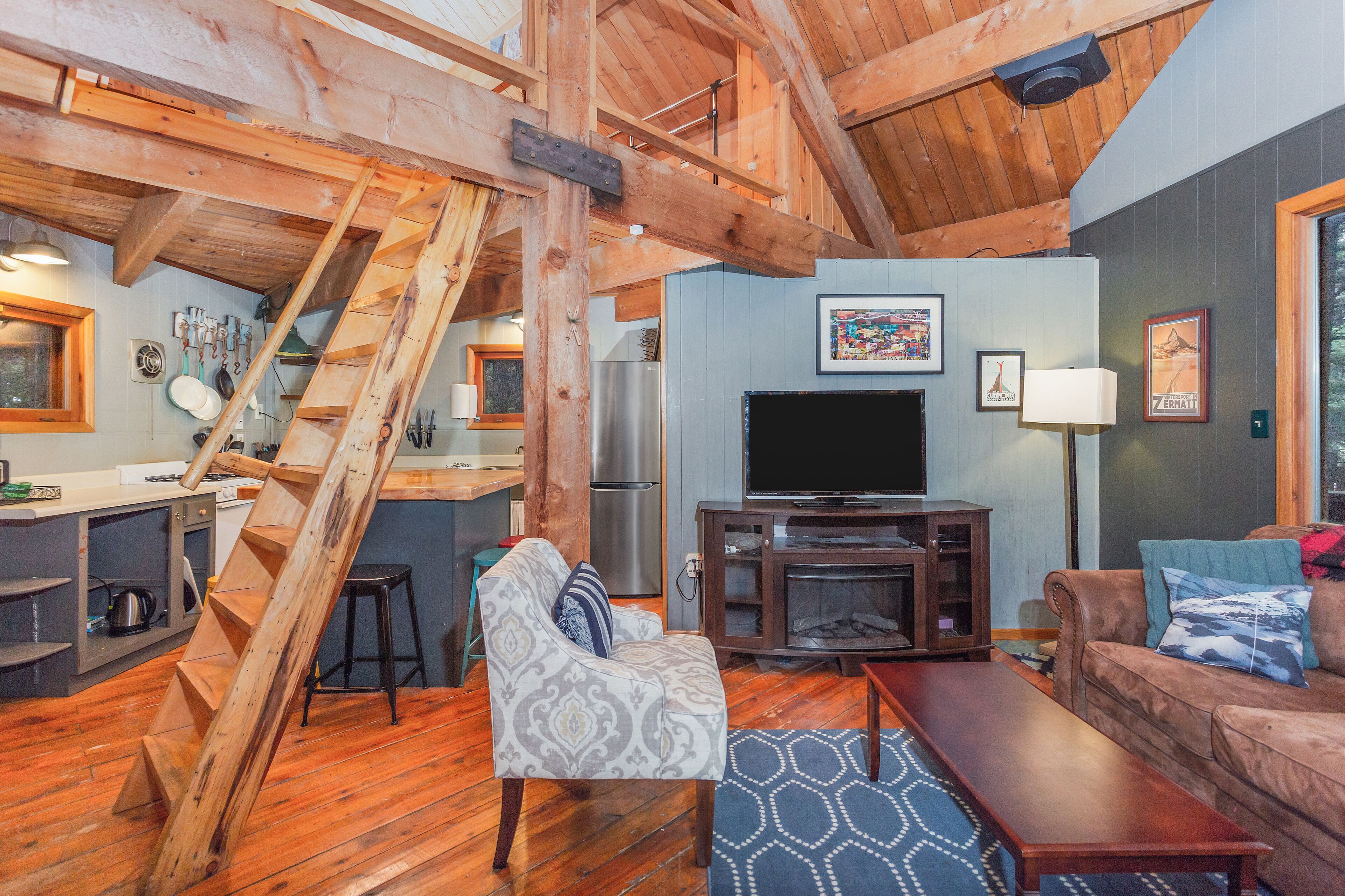 Alyeska Cabin is a one room cabin that has a loft with both a king & full sized bed. The living room also has a queen sized sleeper sofa for additional guests. Enjoy the wood burning stove after a day of adventure if you like, however gas is the main heat source in the cabin.