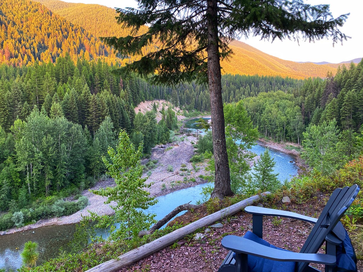 River Edge log cabin only 10 minutes to the West entrance of Glacier National Park. This beautiful cabin is located on a private ranch just steps to the river bank of the Middle Fork River with river access. Located just a 1 minute drive or 5 minute walk to 4 fishing/swimming accesses. A fisherman's dream vacation spot! You can access the river through the woods and down the trail. Steep decline to be expected.