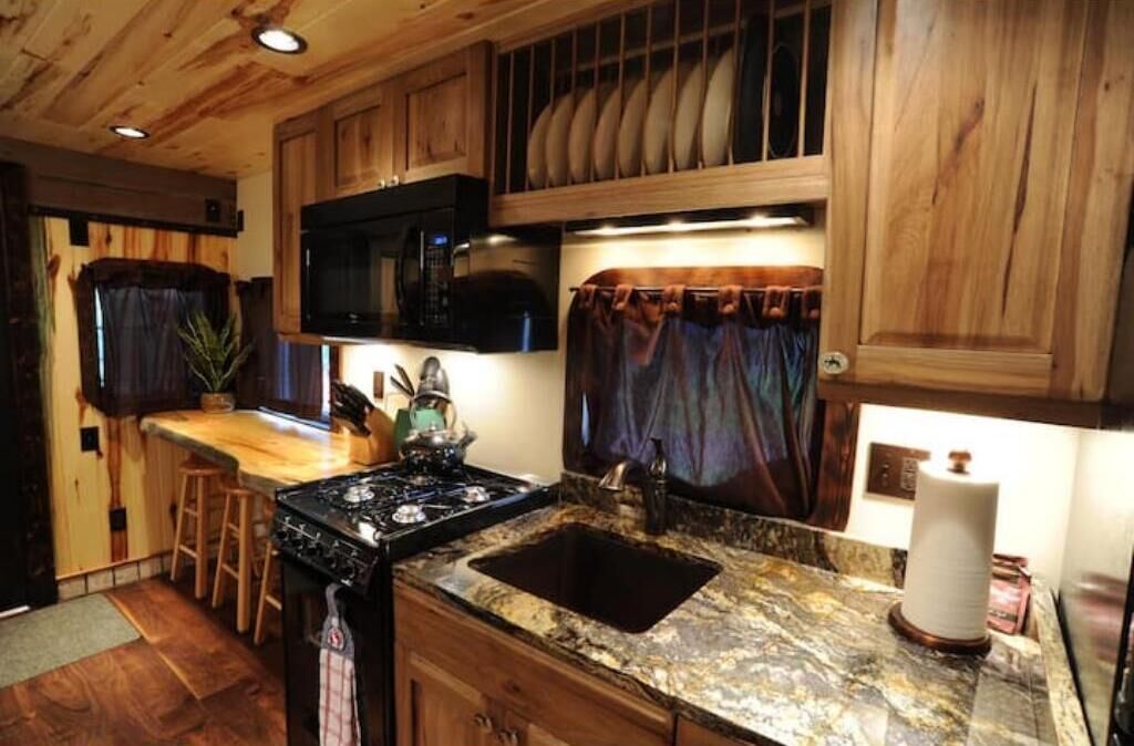 The open living area features a fully equipped and stocked kitchen with comfortable living room, making it the perfect spot to relax after a day in the park.
