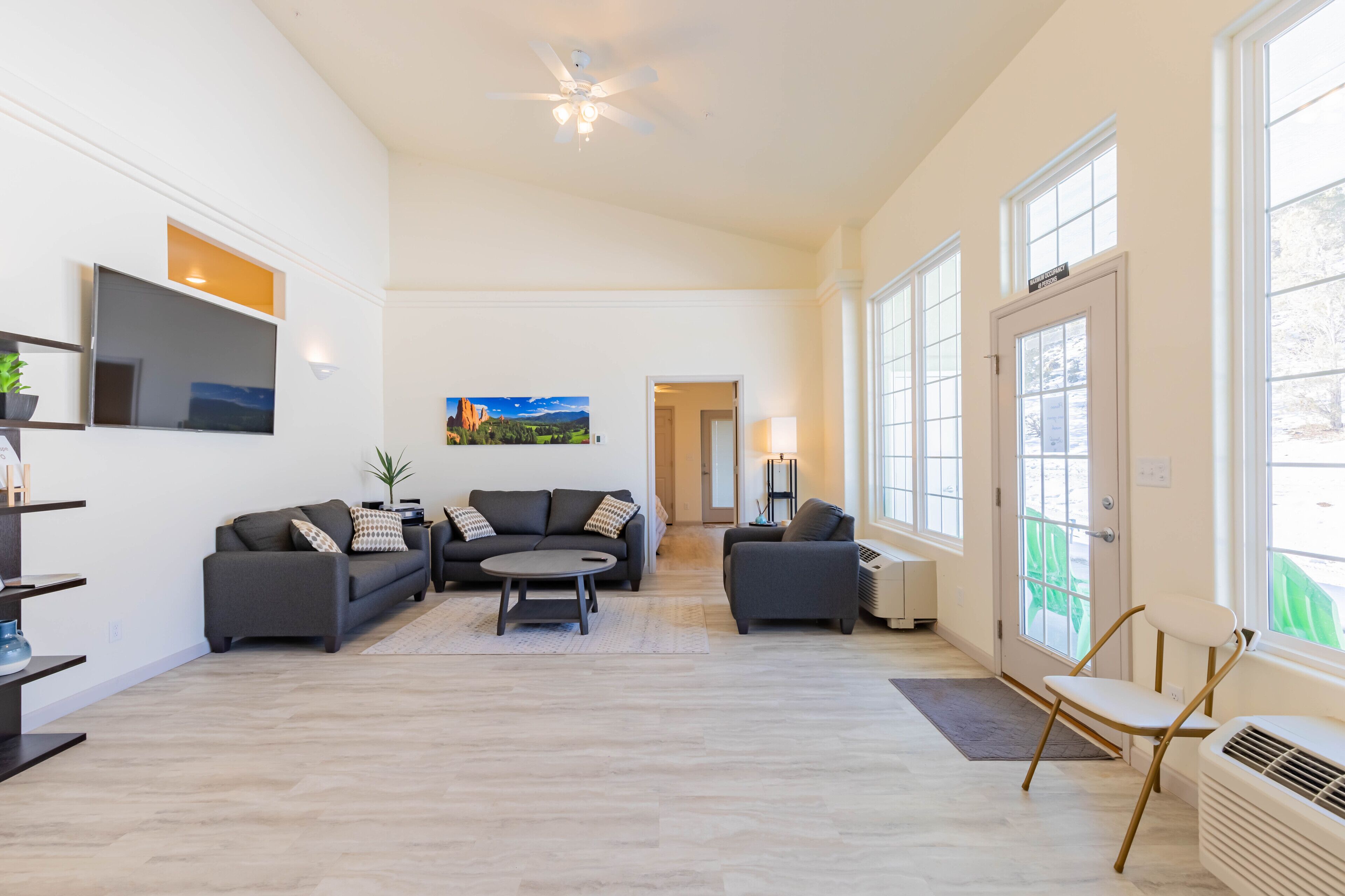 Take it easy in this log cabin located in Fruita Colorado. The cabin is nestled within Monument RV Park with access to it's amenities like a fitness room, pool, hot tub and laundry facility. This adorable cabin features a kitchenette, a Queen sized bed as well as four bunkbeds, a private bathroom and a huge front deck.