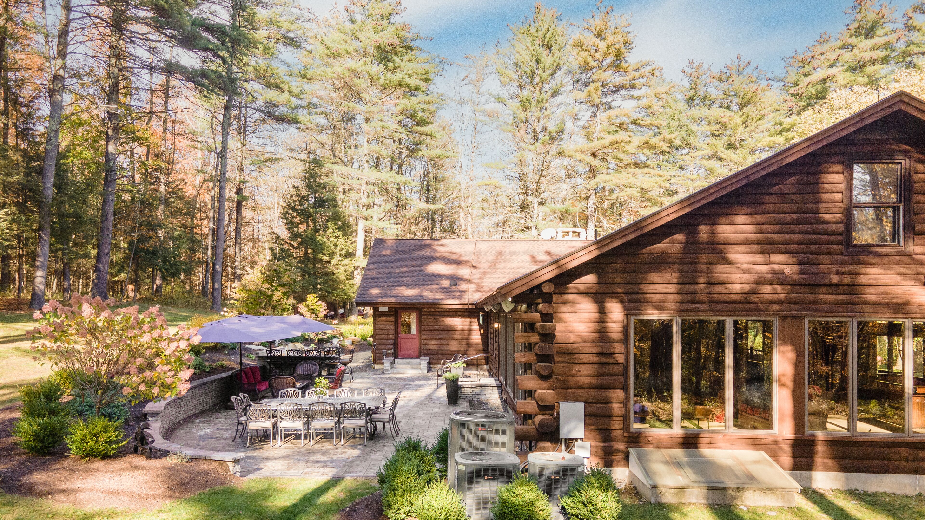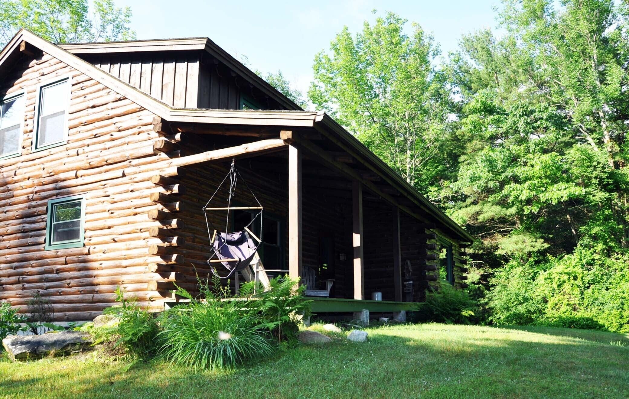 This well kept log cabin has five bedrooms, 2 full baths, an office, and basement with ping pong and laundry. There is a lovely porch with seating and sprawling green lawn. The cabin is set back far away from the road up a private drive.