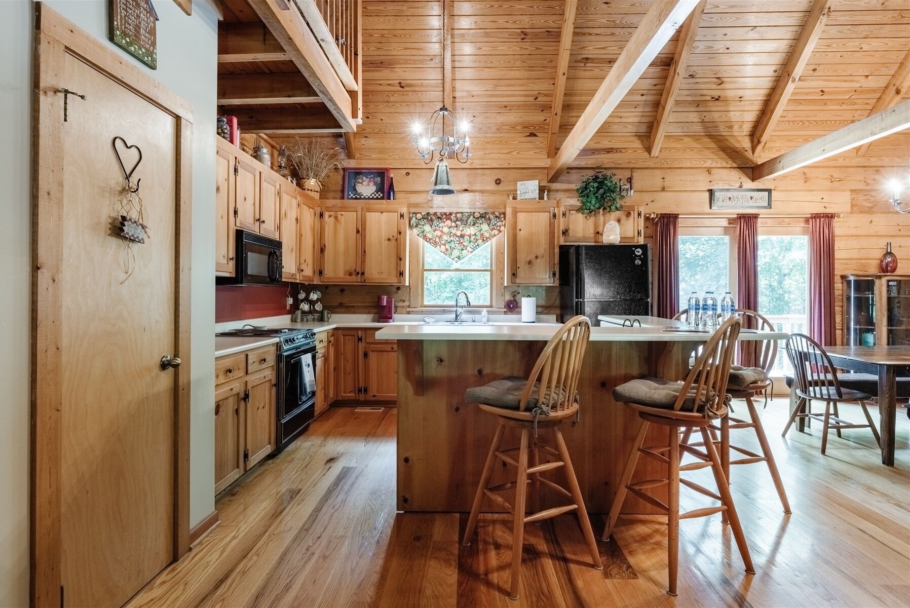 The cabin is thoughtfully designed for easy living, with all essential rooms located on the main floor — including two bedrooms, kitchen, living, and dining areas — while the spacious king bedroom suite with loft sits upstairs. Accessibility is a priority: there’s just one step up to the porch and a gentle half-step into the cabin itself. The main-floor bathroom features an easy-access shower with no tub to step over, while the upstairs suite offers an extra-deep soaking tub — perfect for a relaxing end to your day.