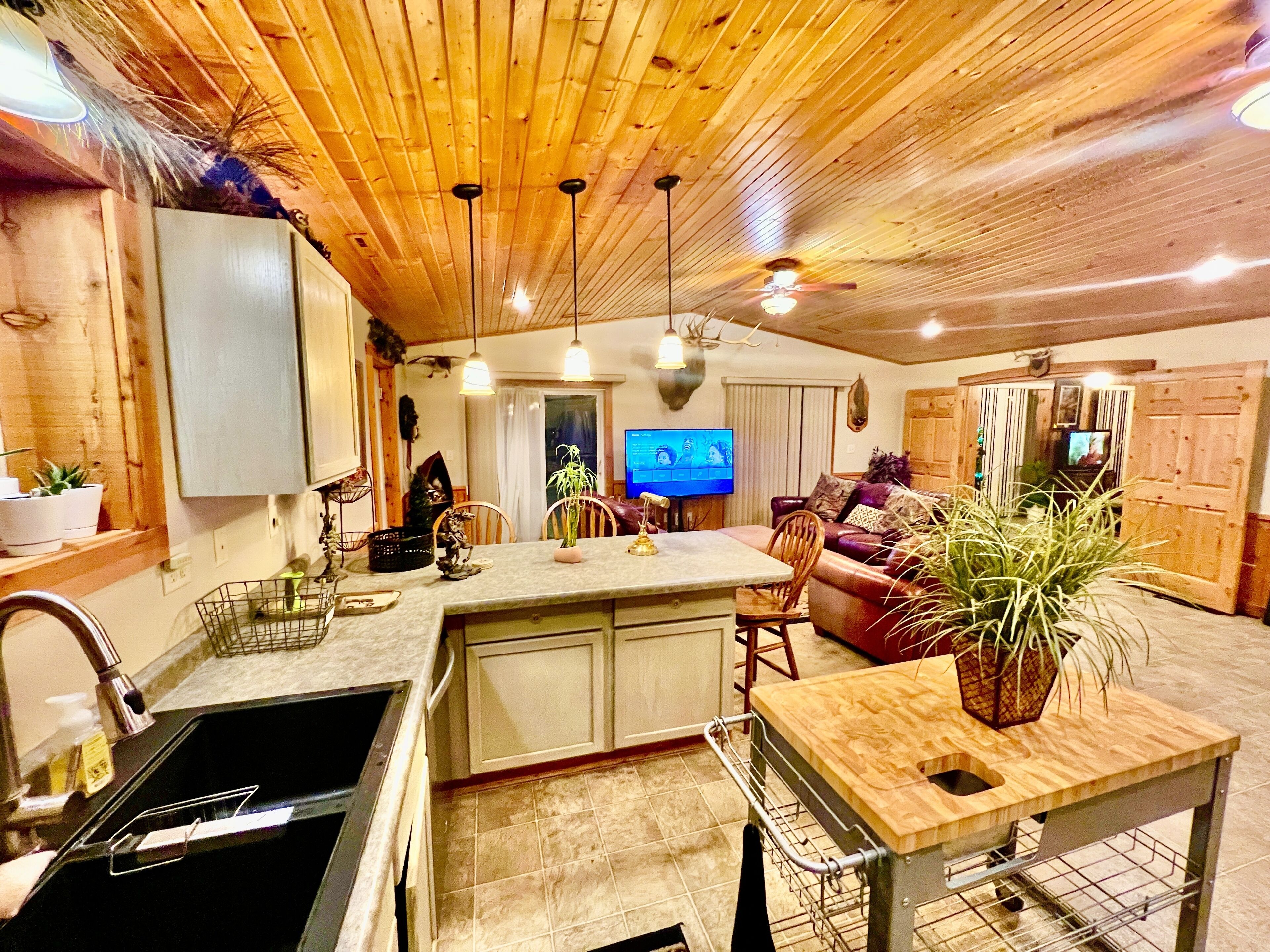2 bedroom, 1 bath home that features an open concept kitchen and family room. There is a detached screened-in gazebo, which is perfect for relaxing bug-free. Also included in a firepit and firewood. Sleeps 8 on beds - 1 queen, 1 full and 4 twins. It is perfect for family vacations, hunting or fishing trips, motorcycle adventures, or just a quiet weekend away.