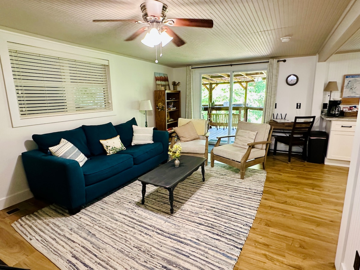This cozy chalet offers all the charm and romance needed for a great getaway. The large bedroom has a king bed with luxury linens, full lake view with an app based TV. The oversized bath is wonderfully decorated with a separate shower and jacuzzi tub. Chalet is furnished with a lovely mix of antiques and designer furniture, giving you an "at home" and cozy atmosphere. Fully equipped kitchen and laundry. Full view from the kitchen and great room. Smart TV's with fire sticks. Swing, dine or rock and read on the wonderful back porch or head through the grassy lawn to the fire pit and dock for fishing, swimming or boating. Dock has four slips and a public ramp is just down the road. Gas grill also available. Because we have two cabins available, the cabin will show available unless both are rented. We provide a kayak and paddle board free to our guests.
