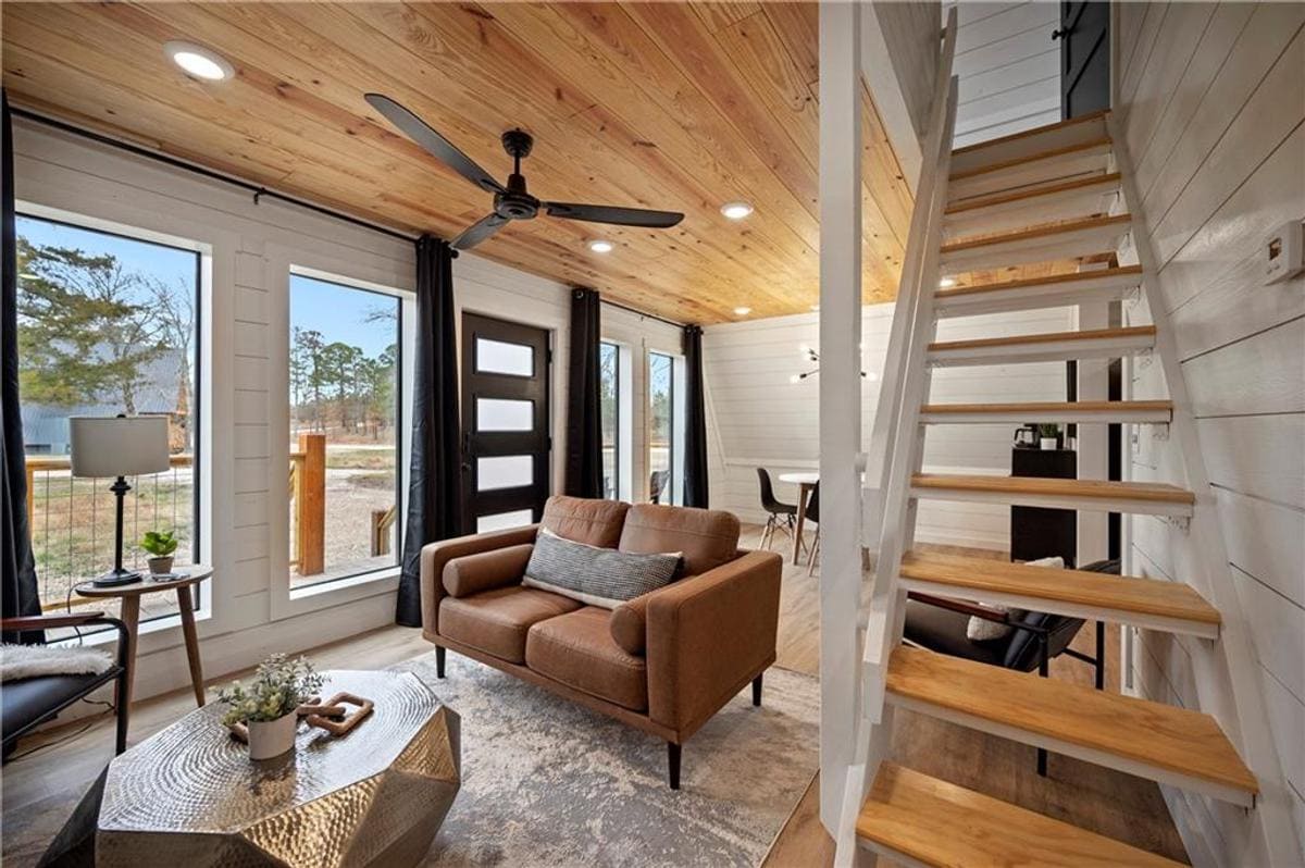 From the moment you step inside, you'll be greeted by warm wooden interiors, expansive windows, and modern furnishings that create an inviting yet refined atmosphere. The open-concept living area boasts plush seating, a floor-to-ceiling stone fireplace, and a smart TV, making it the perfect spot to unwind after a day of exploring.