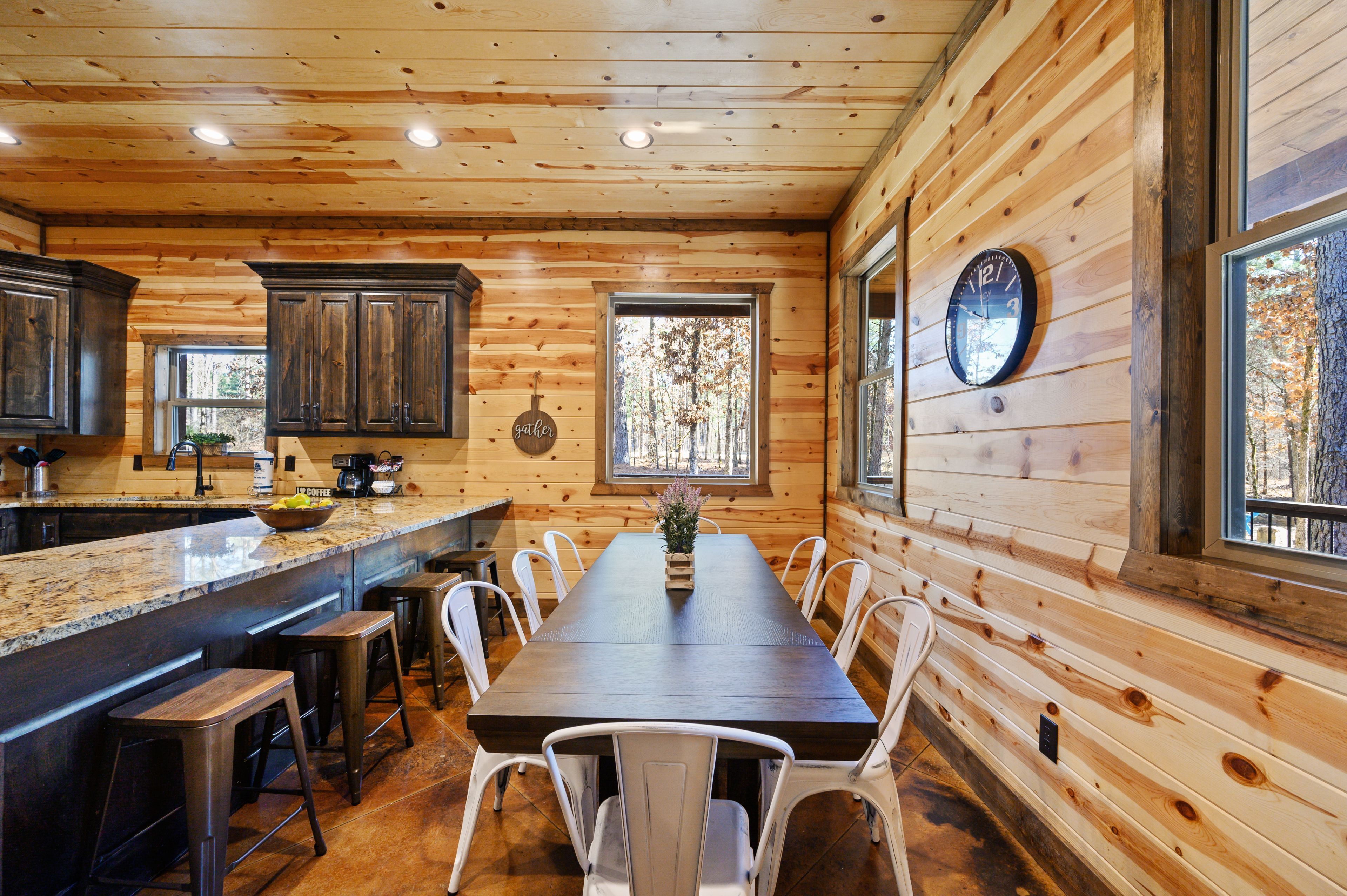 Step outside to discover a stunning outdoor oasis nestled in the towering pines of the Ouachita National Forest. Enjoy relaxing evenings in the hot tub, or roast marshmallows and share stories around the campfire while listening to your favorite tunes.