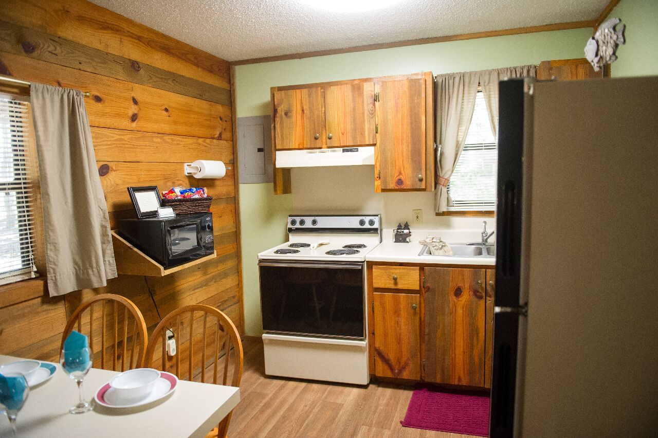 Full size kitchen is equipped with everything you need to create a delightful meal. After a long day enjoy the king size bed and optional sleeper sofa if needed. Outside is sure to please with a wonderful fire pit for s'mores or just more relaxation. Nothing is better than lounging in the hot tub on a peaceful night. Located in a prime location close to everything while still maintaining privacy. Book now for your getaway at Down Time.