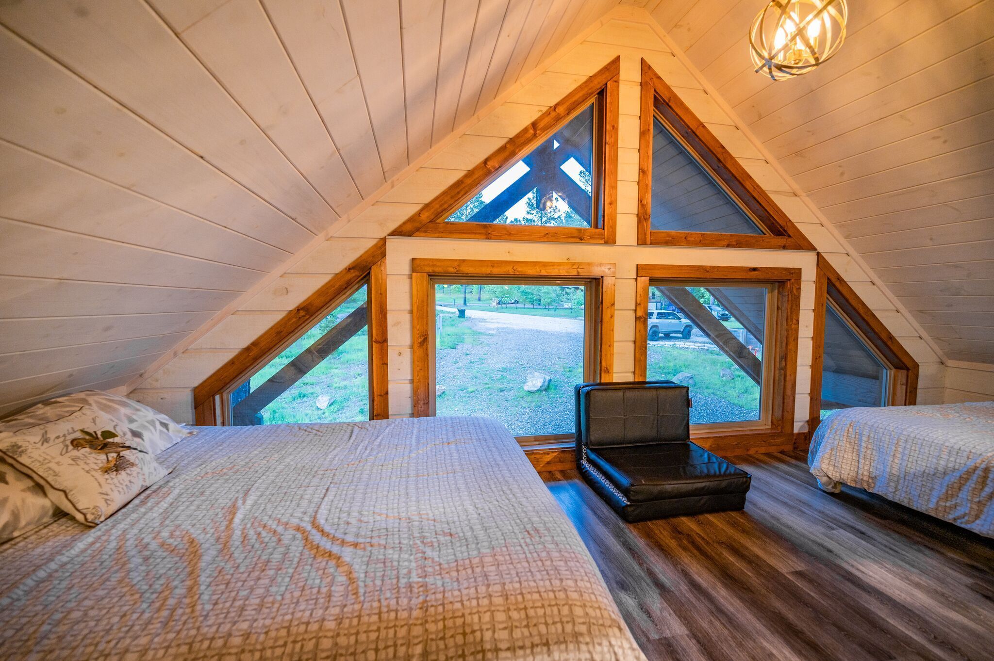 Step inside the Unwind Cabin and be welcomed by an open concept kitchen and living room boasting stunning cathedral ceilings. This spacious layout creates an airy and inviting atmosphere, perfect for entertaining or simply enjoying each other’s company. At the heart of the cabin, the exquisite double-sided fireplace serves as a true centerpiece, inviting you to snuggle up with your loved one as warm flames dance before you, ideal for sharing whispers and laughter.