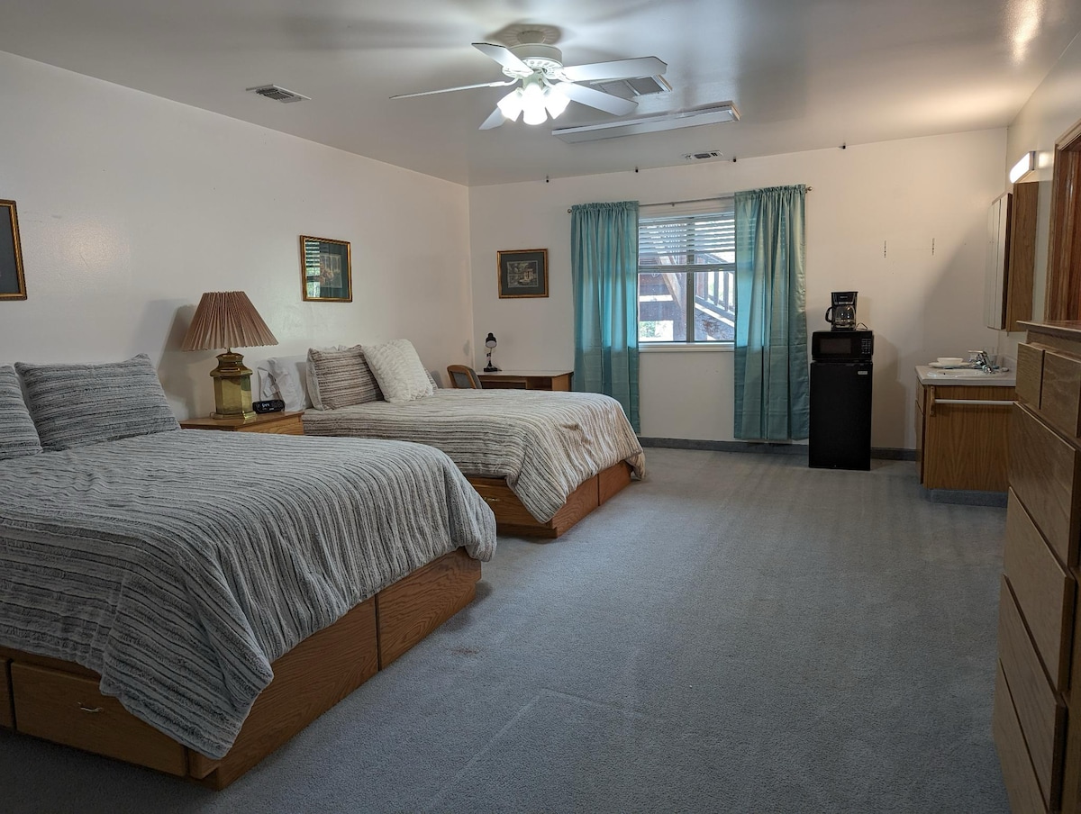 Each lodging has fully equipped kitchens for your food preparation. The kitchens have full size stove, refrigerators, (2 larger fridges in lodge), microwaves, and much more for small appliances.