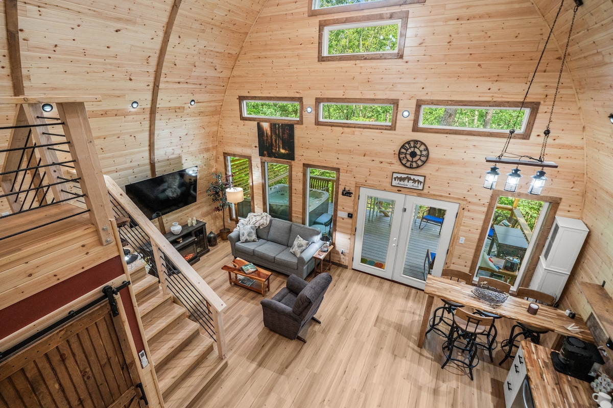 The Cedar Springs Cabin, located on the outskirts of beautiful Hot Springs, Arkansas, is a unique, one-of-a-kind experience. This beautifully crafted structure is rustic, yet modern. Enjoy gorgeous views from the top balcony or relax downstairs on the custom outdoor swinging bed. The property is perfect for a romantic couples getaway but also incredibly family-friendly with the outdoor game area and "buried bus" theater room!