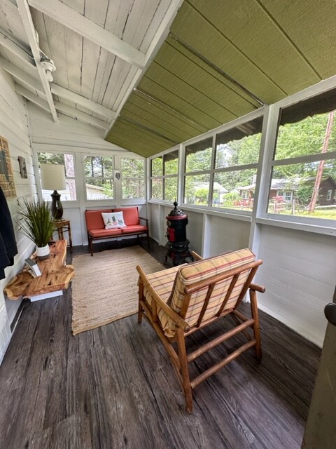 A cozy space made even cozier by the wood-burning stove. It is very easy to operate and puts out a surprising amount of heat. As it's a single room, it heats everything up marvelously. The space is small but not tight, but rather cozy and intimate.