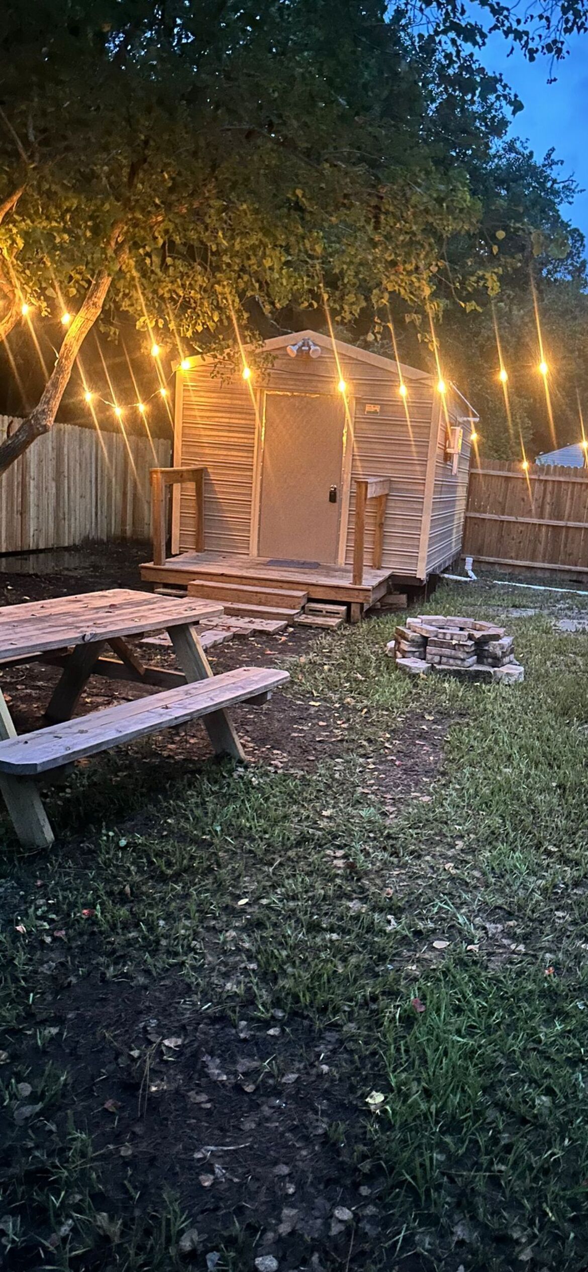 small cabin in my backyard with a shared bathroom and outdoor shower