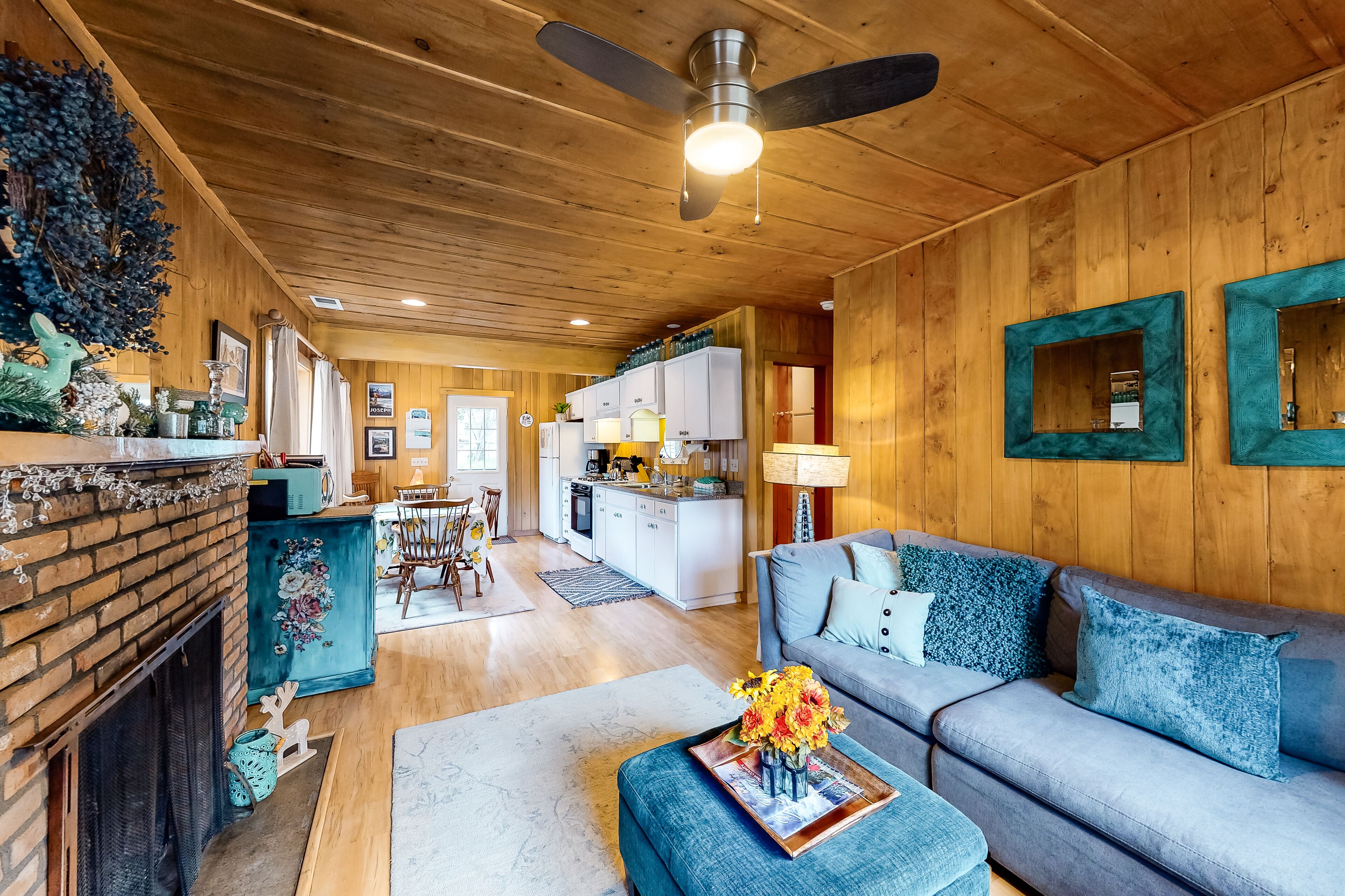 Inside, wood-paneled walls create a wonderfully cozy atmosphere. Prepare your favorite meals using the kitchen's stainless steel appliances, gather for dinner and card games at the dining room table, and spend your evenings streaming movies in the lakefront living room. Two charming bedrooms, free WiFi, and a private washer/dryer are also provided.