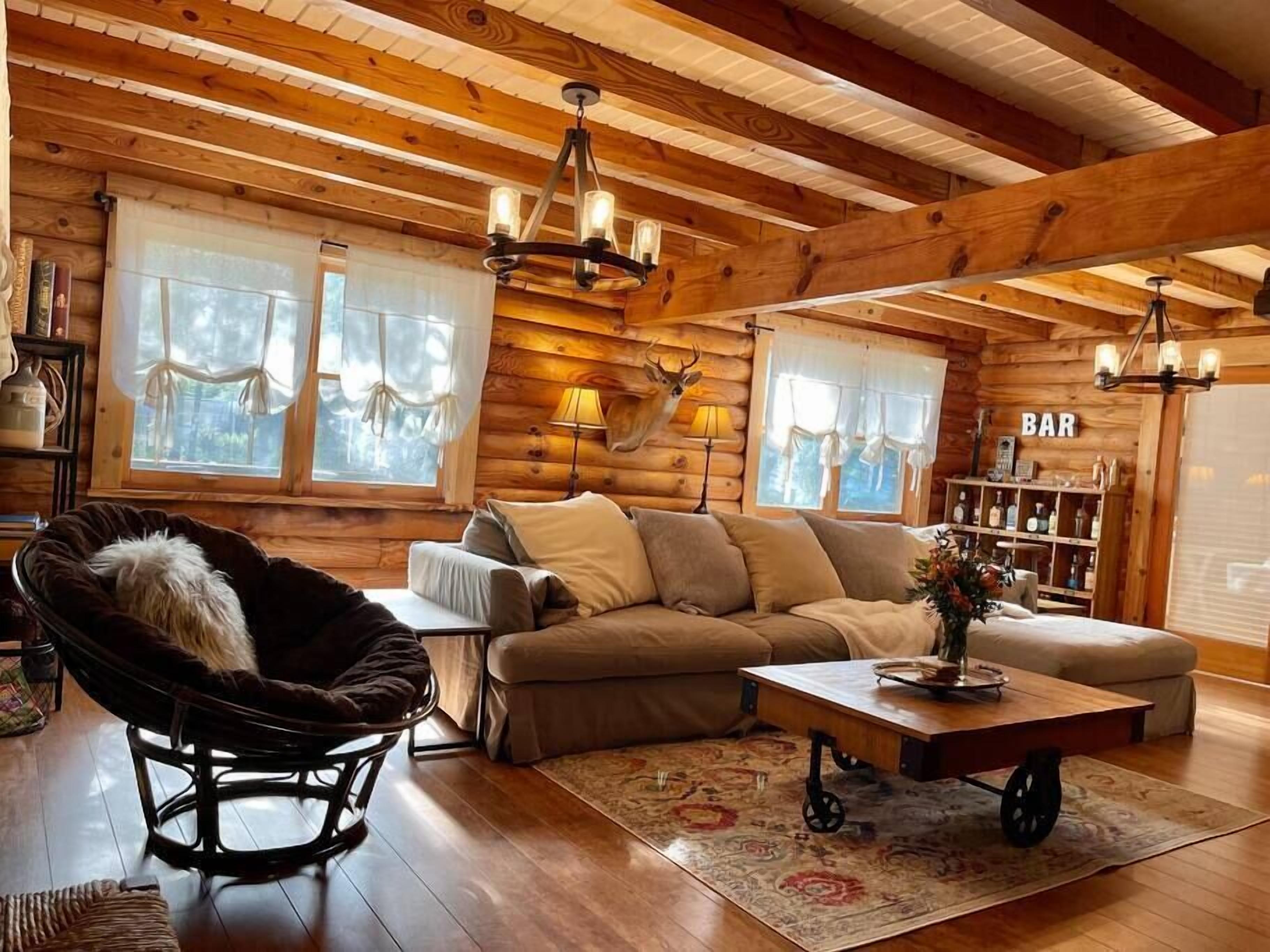 This real log cabin was updated in 2023 and has 3 bedrooms, 2 full bathrooms and a flex mudroom complete with new washer / dryer and sink. The beautiful fully equipped kitchen is updated to a modern farmhouse style, complete with high ceilings, white shaker cabinets, white subway tile, white calacatta quartz countertops and a white farmhouse sink.