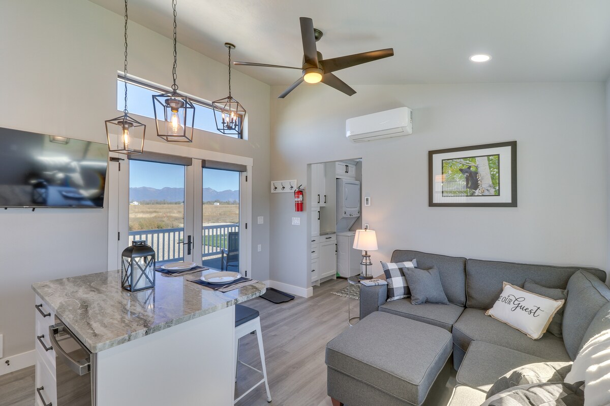 Retreat in a peaceful modern space after an exciting day exploring Glacier Park or skiing Whitefish Mountain. Nestled in an orchard and surrounded by grazing horses, you will be able to relax on the deck with a gorgeous view of the Rocky Mountains. With a fireplace and a shared hot tub space, you will find a peaceful retreat as you make the most of your visit to the Flathead Valley.
