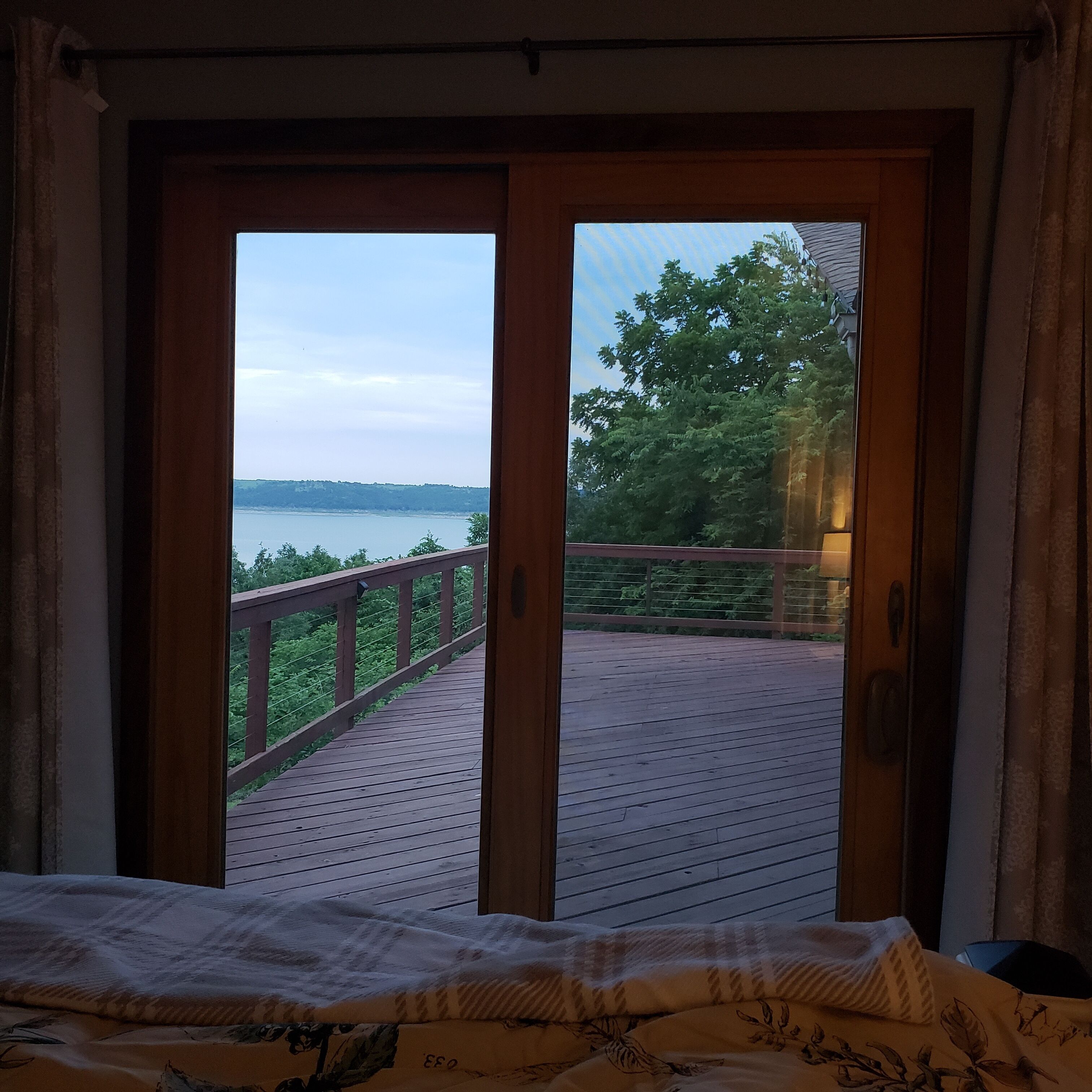 Behind the coffee bar a set of stairs lead to the private top floor bedroom and deck. Guests looking for romance in a private setting away from the kids will find that this room provides just that. Enjoy an evening glass of wine with your significant other on the private deck while taking in lake views and starry night skies. The back deck area features a comfy outdoor sectional for lounging and a propane fire pit to help set the mood.